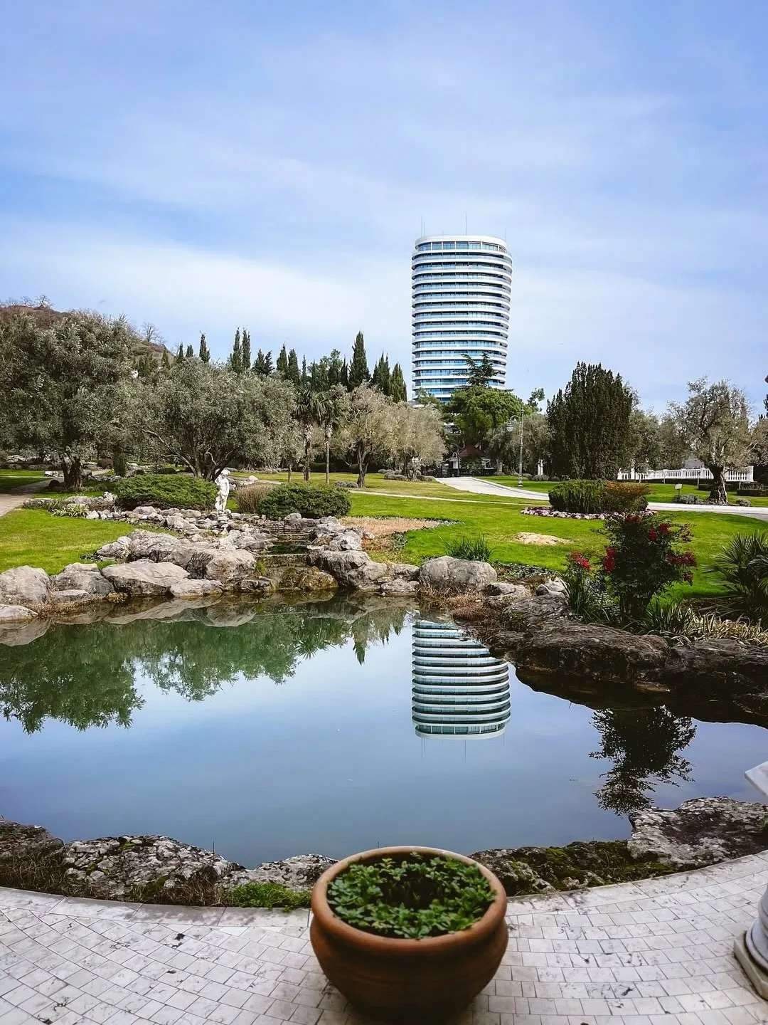 Парк разбит на террасах у моря и включает аллеи, кипарисы, оливковые и хвойные посадки, декоративные пруды и смотровые площадки. Планировка подчинена рельефу местности и сочетает природные участки с оформленными композициями.