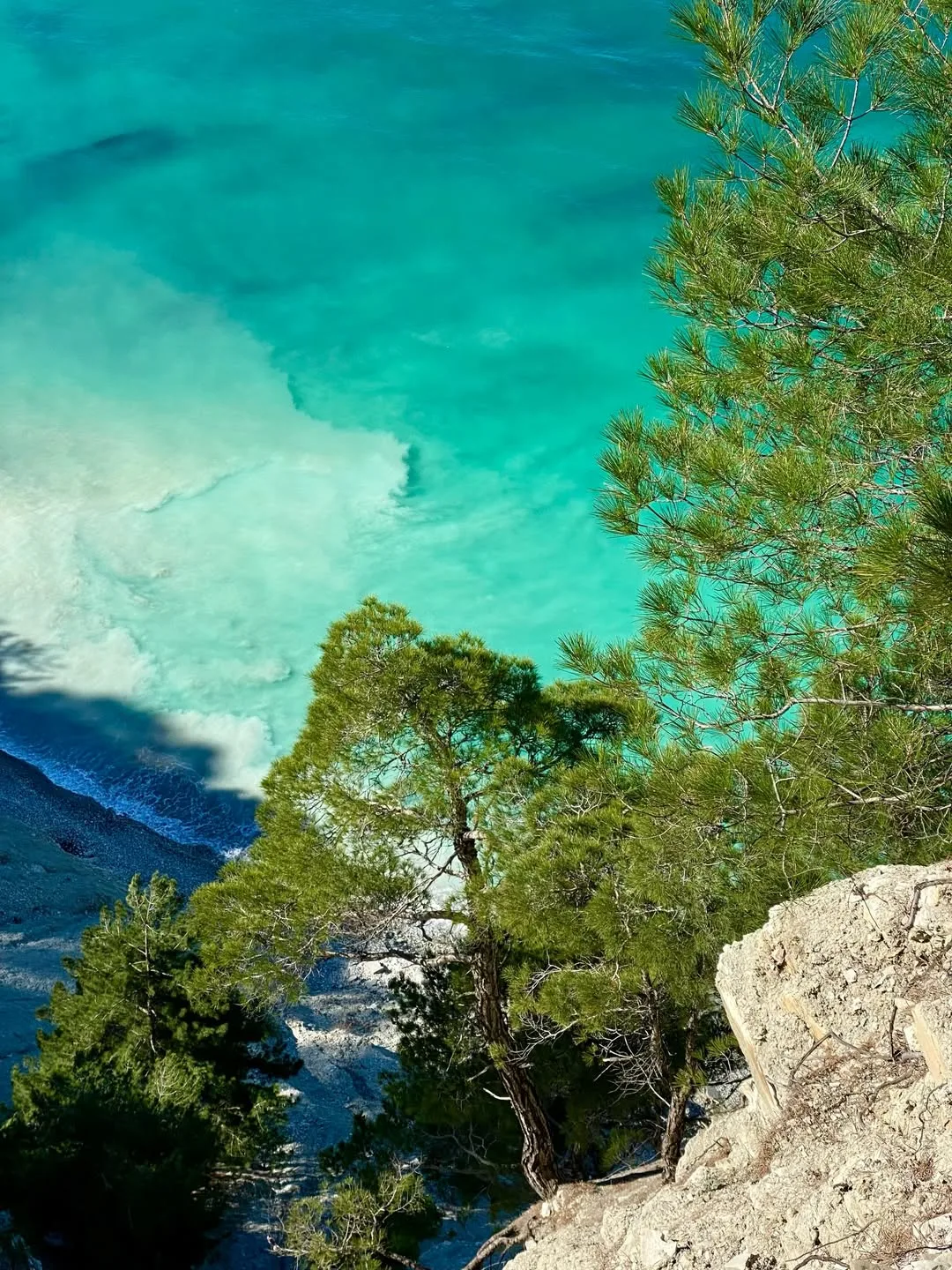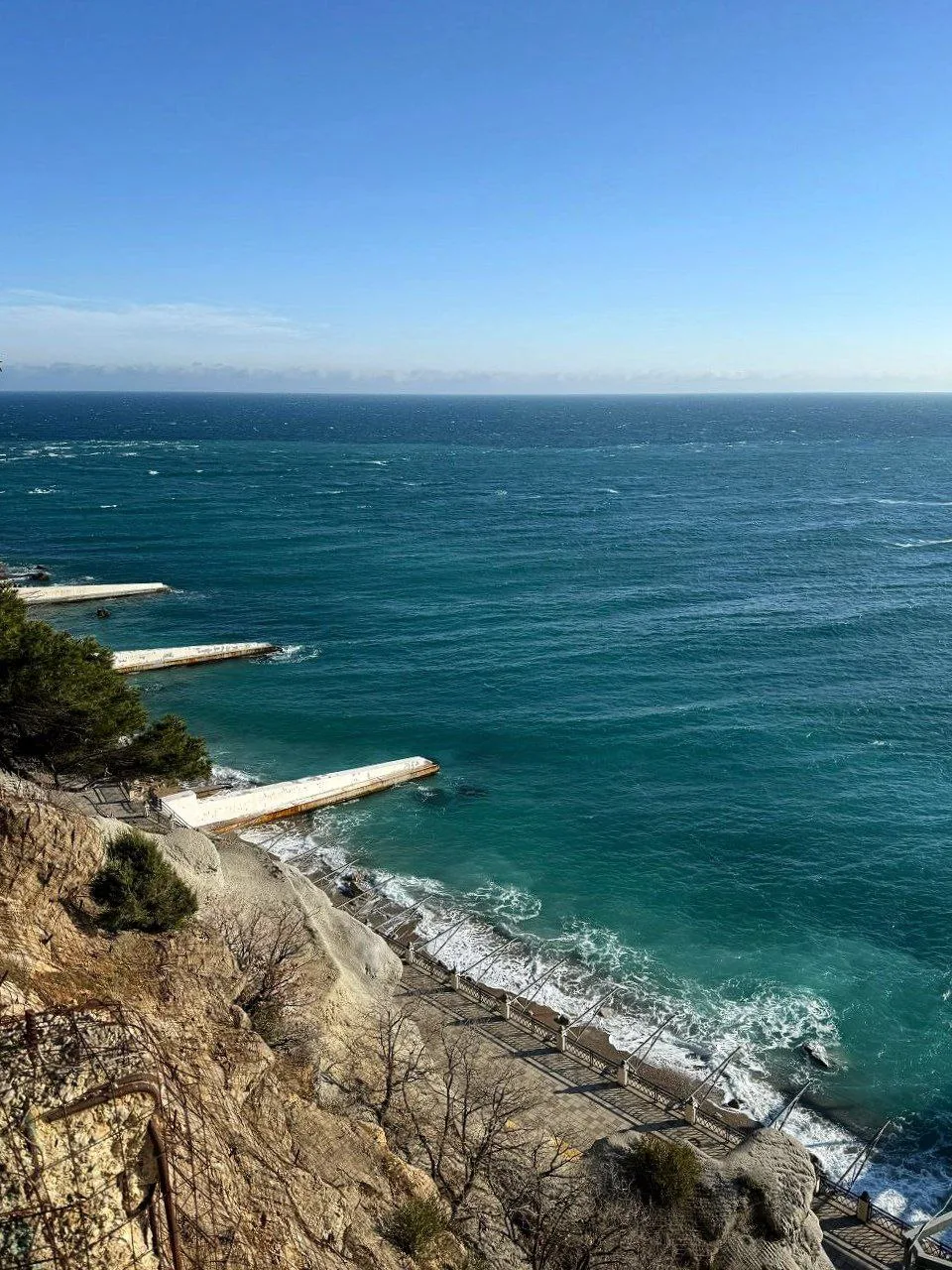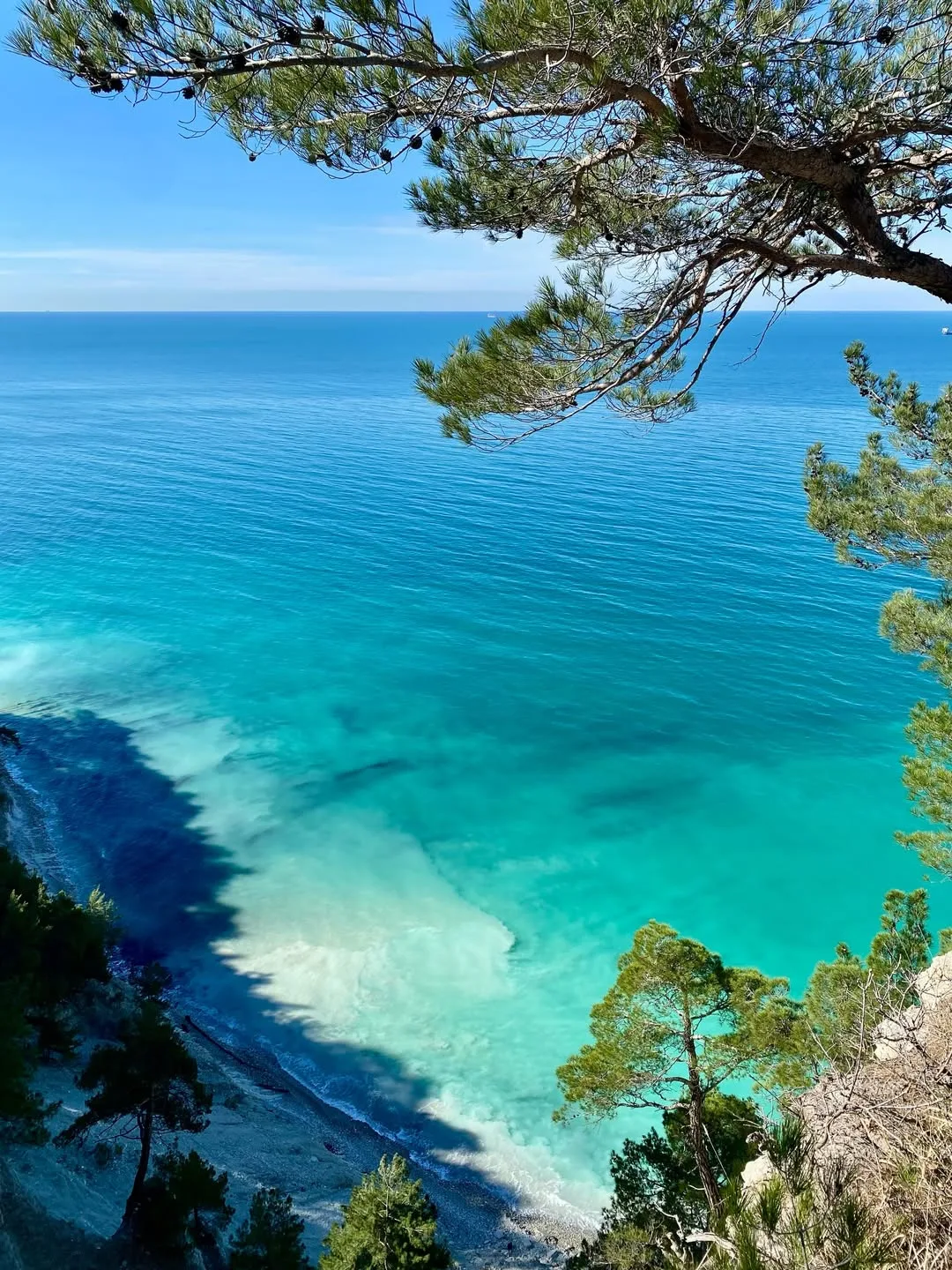Внизу — дикий пляж с крупной галькой и соснами. Спуск крутой, требует осторожности, зато внизу почти нет курортной суеты: только море, скалы и тишина.