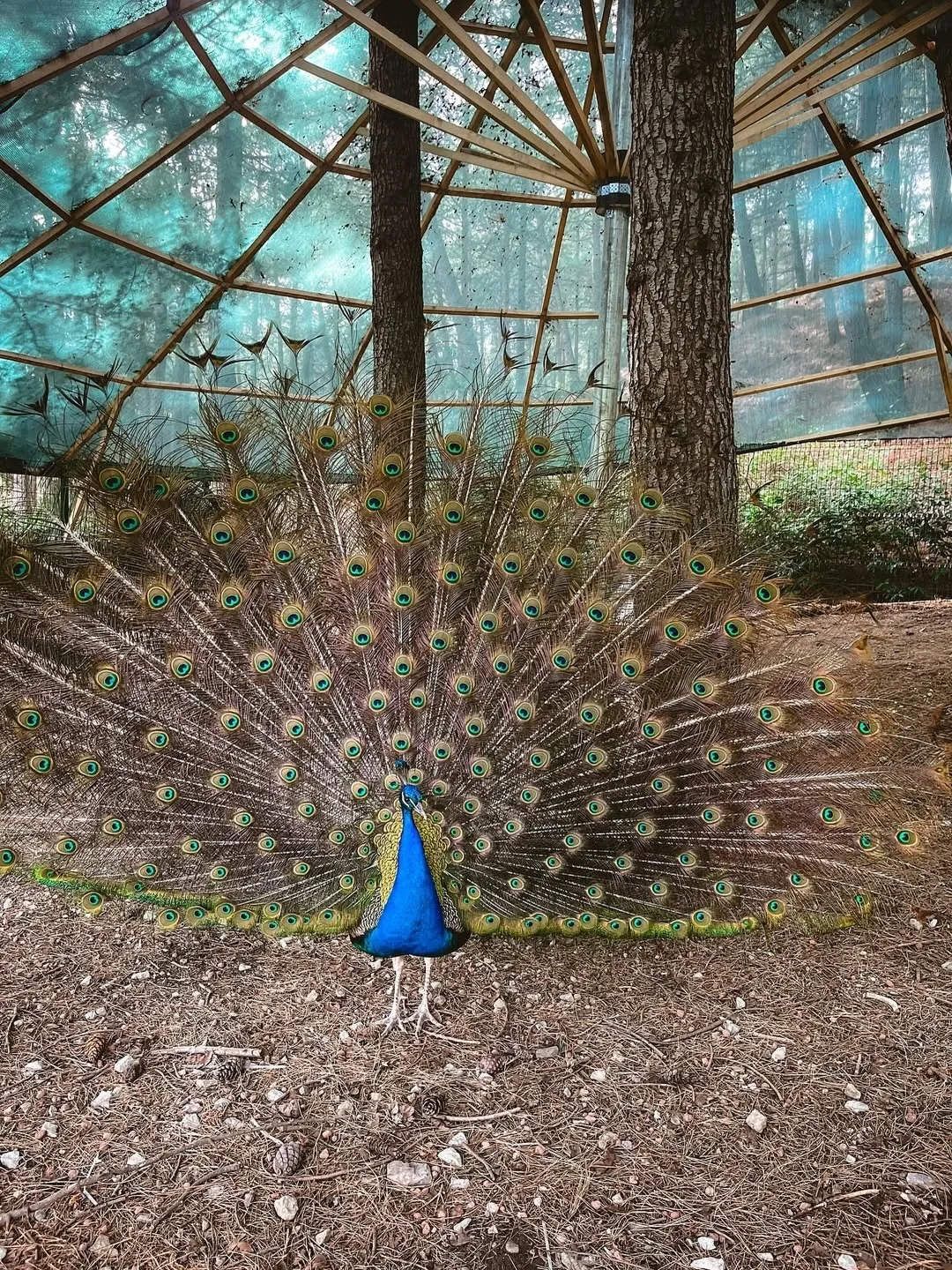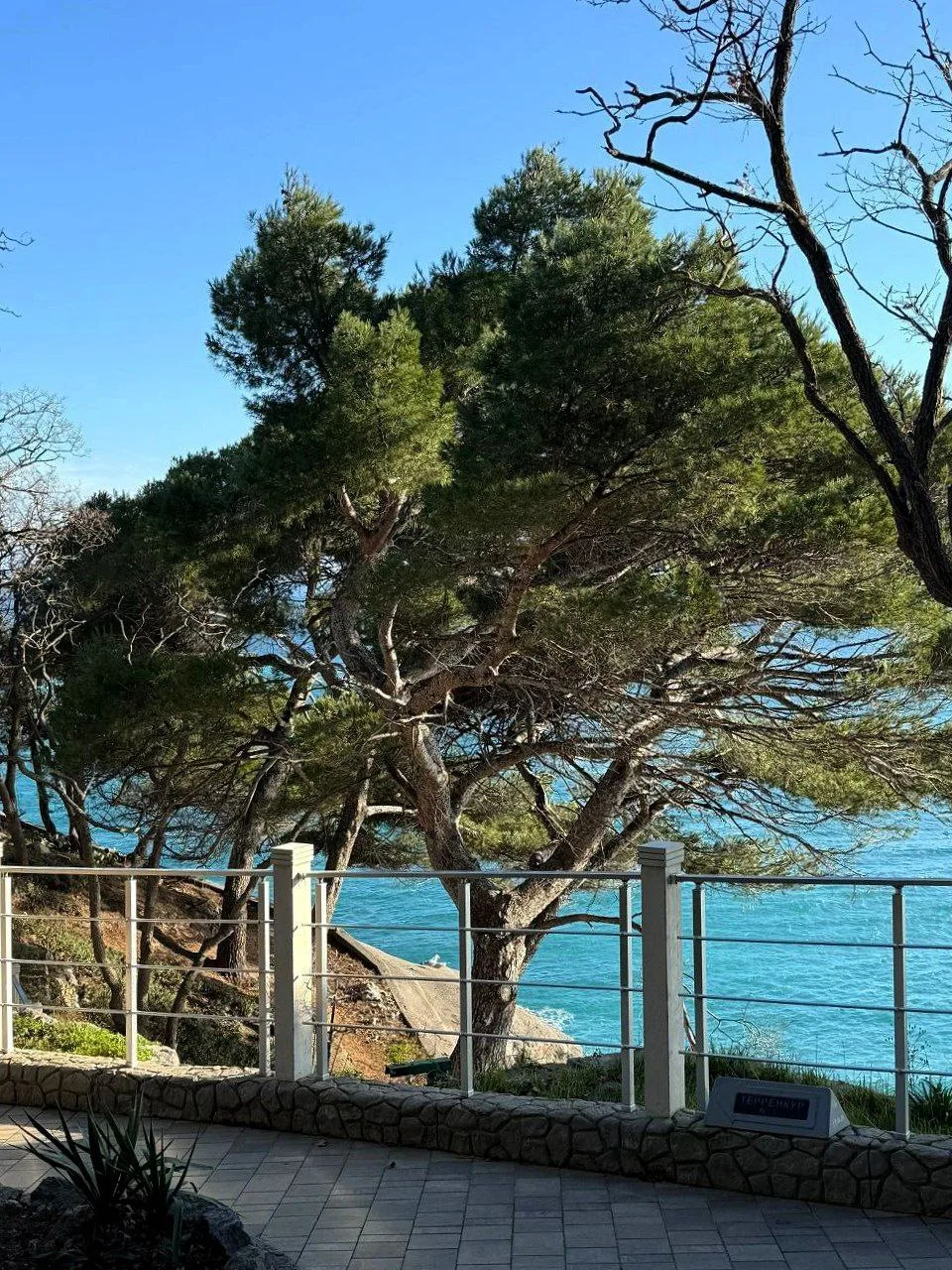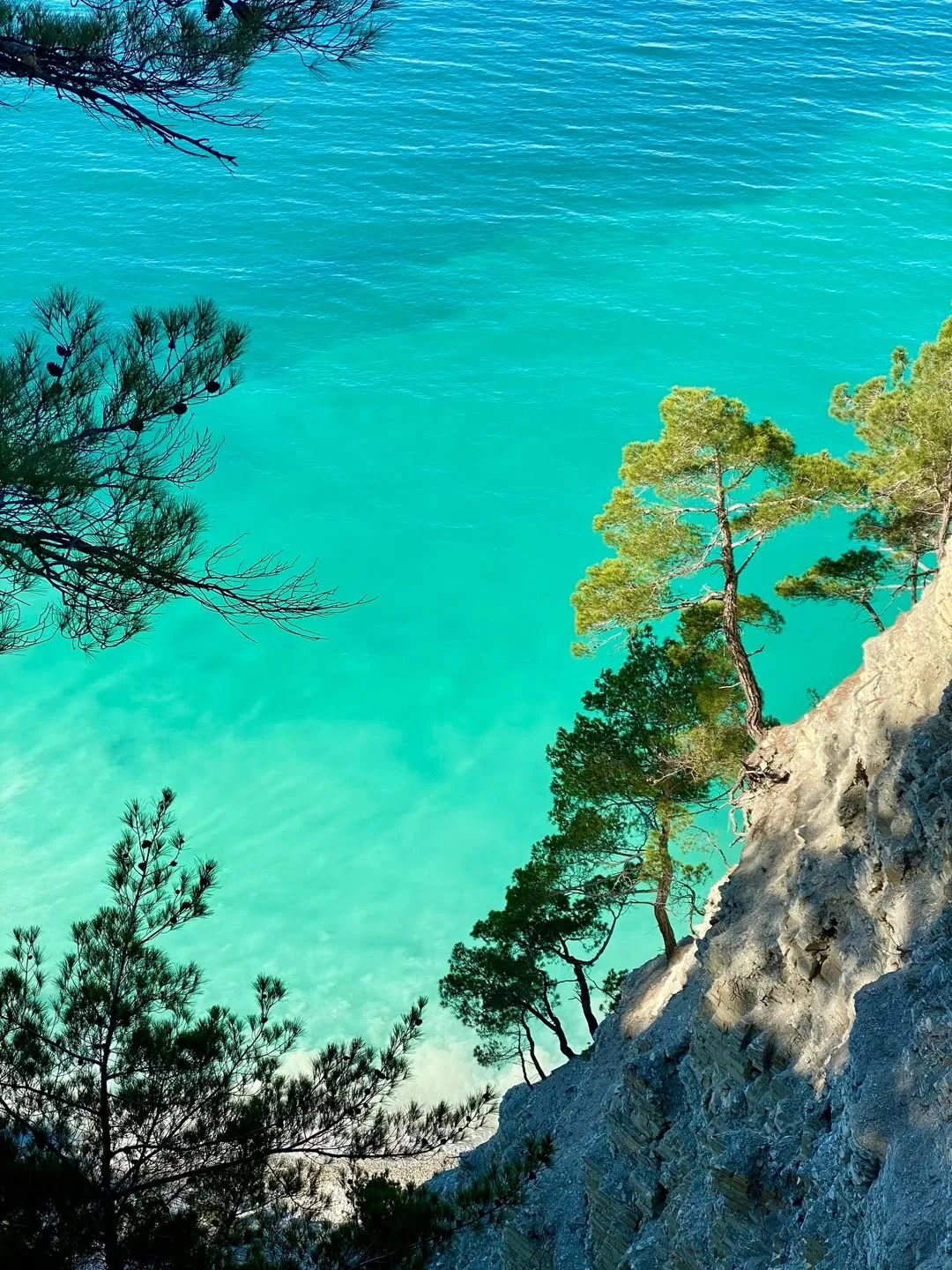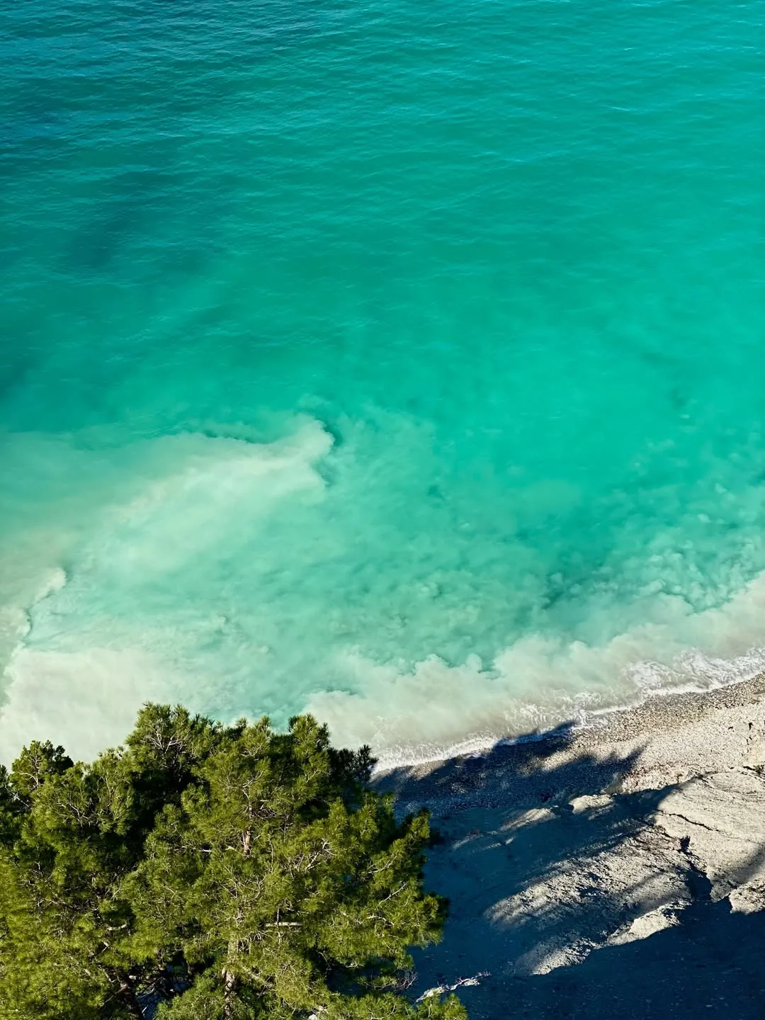 Внизу — дикий пляж с крупной галькой и соснами. Спуск крутой, требует осторожности, зато внизу почти нет курортной суеты: только море, скалы и тишина.