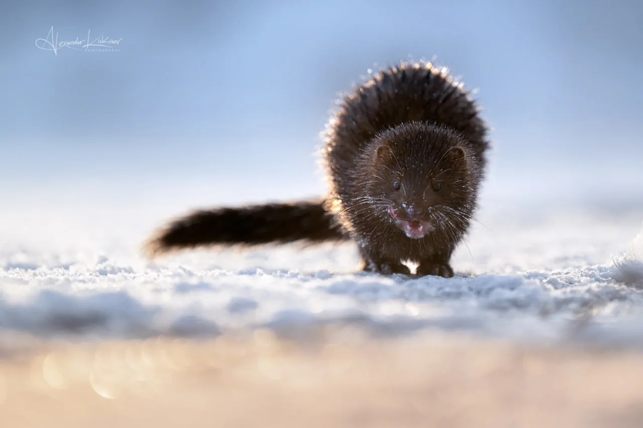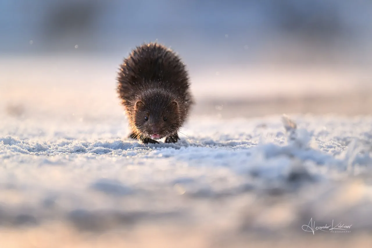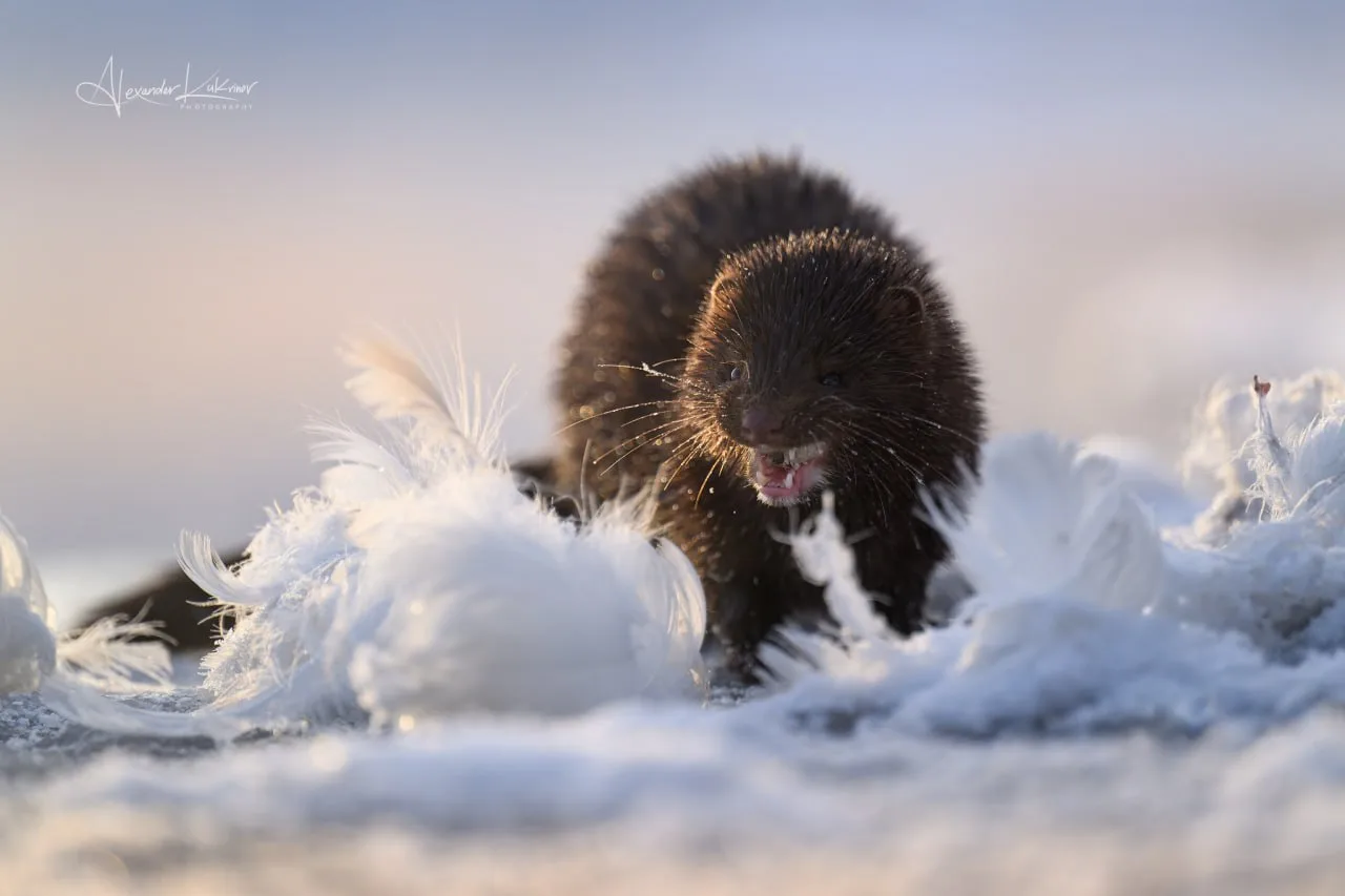 Во время поездки удалось заснять очаровательную норку, стоящую в... лебединых перьях.