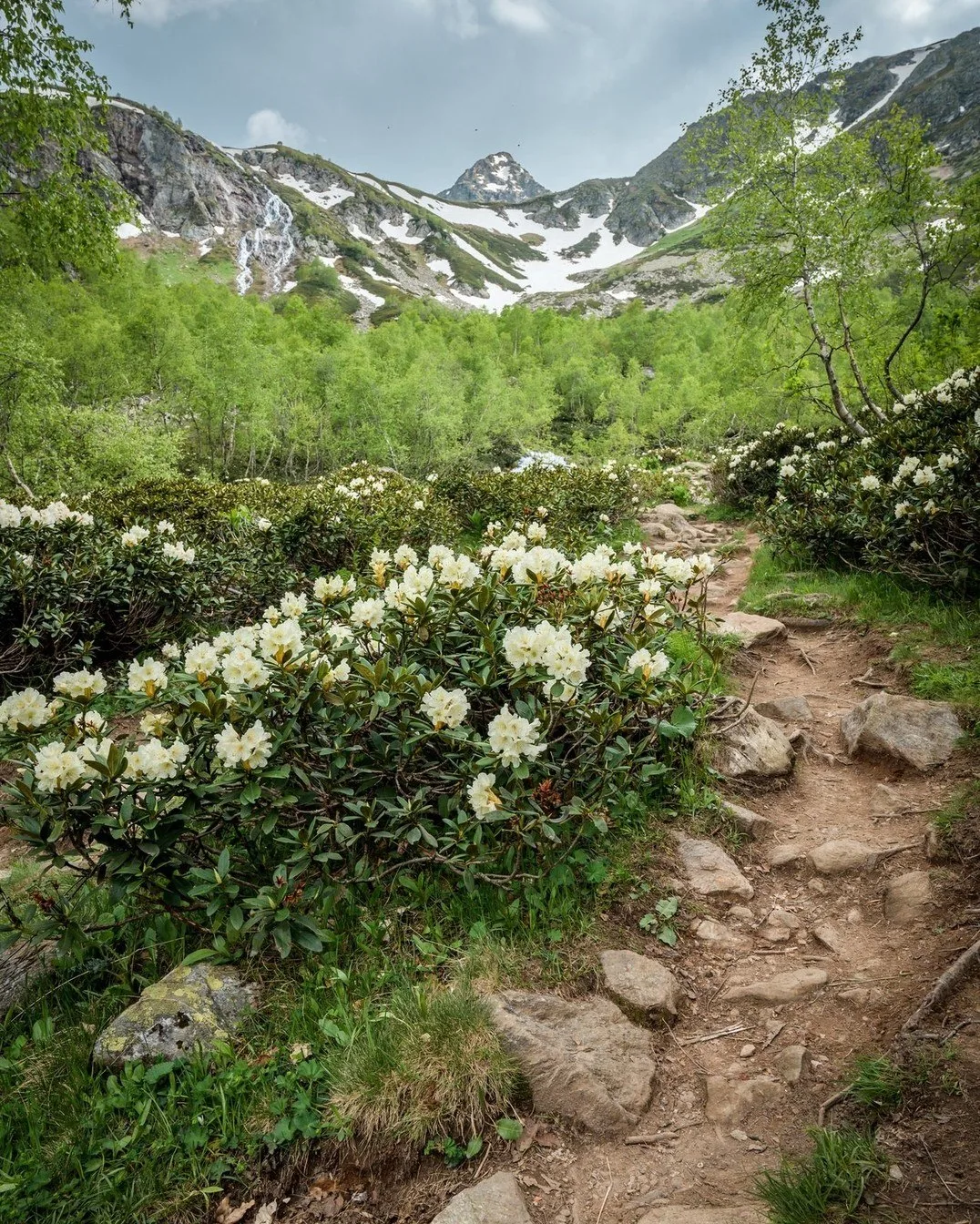 Скоро лето, и в горах Кавказа начнётся цветение рододендронов. Склоны постепенно покроются розовыми кустами, меняя привычный пейзаж почти полностью.