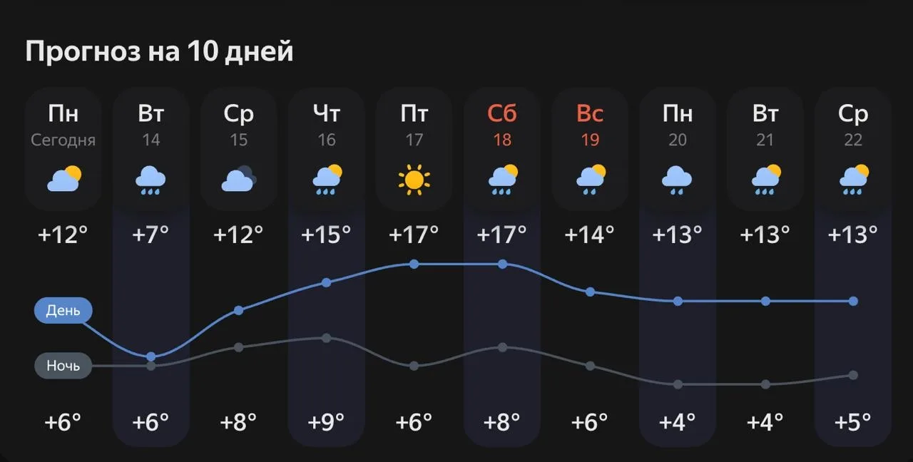 Суббота, 18 апреля ☁️: облачно с прояснениями. Днём до +13°C, ночью до +8°C. Ветер южный 6-11 м/с, ночью слабый 0-5 м/с.