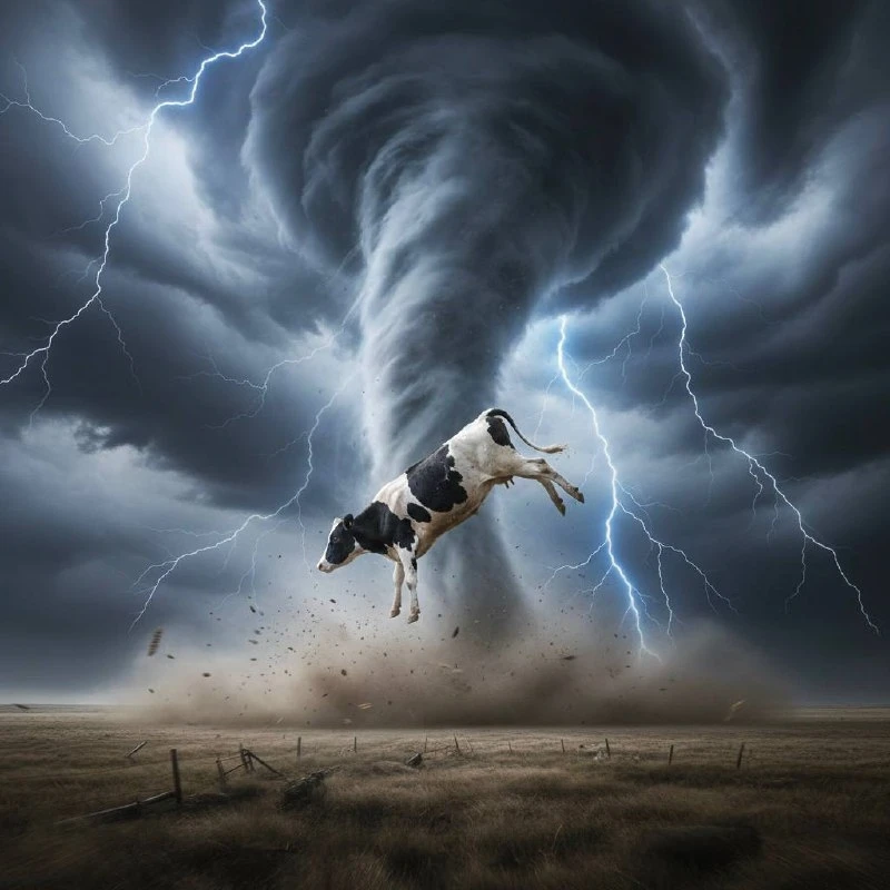 - торнадо может засосать корову и поднять её на высоту до километра, а иногда даже «выплюнуть» из облака вместе с другими предметами.