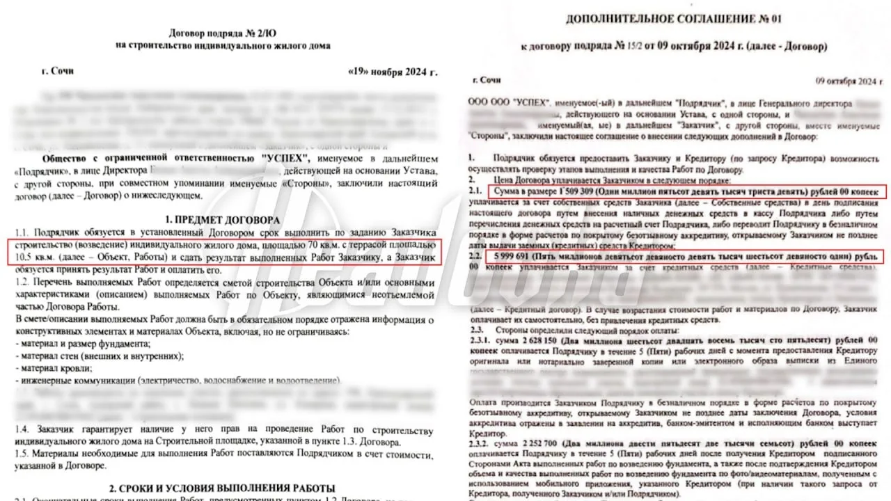 В Сочи семейство хотело построить свое уютное гнездышко на новом участке, но вместо этого остались с огромным долгом и без дома. Все было так: в 2024 году семья Чаплыгиных купила землю для стройки дома. За строительством они обратились к компании с уверенным названием ООО «Успех». В октябре этого же года супруги заключили с компанией договор подряда и в тот же день подписали ипотечный договор в банке почти на ₽6 млн. Строительство должны были закончить до 28 марта 2025 года, а ипотечные деньги перечислялись бы подрядчику поэтапно — по актам выполненных работ.