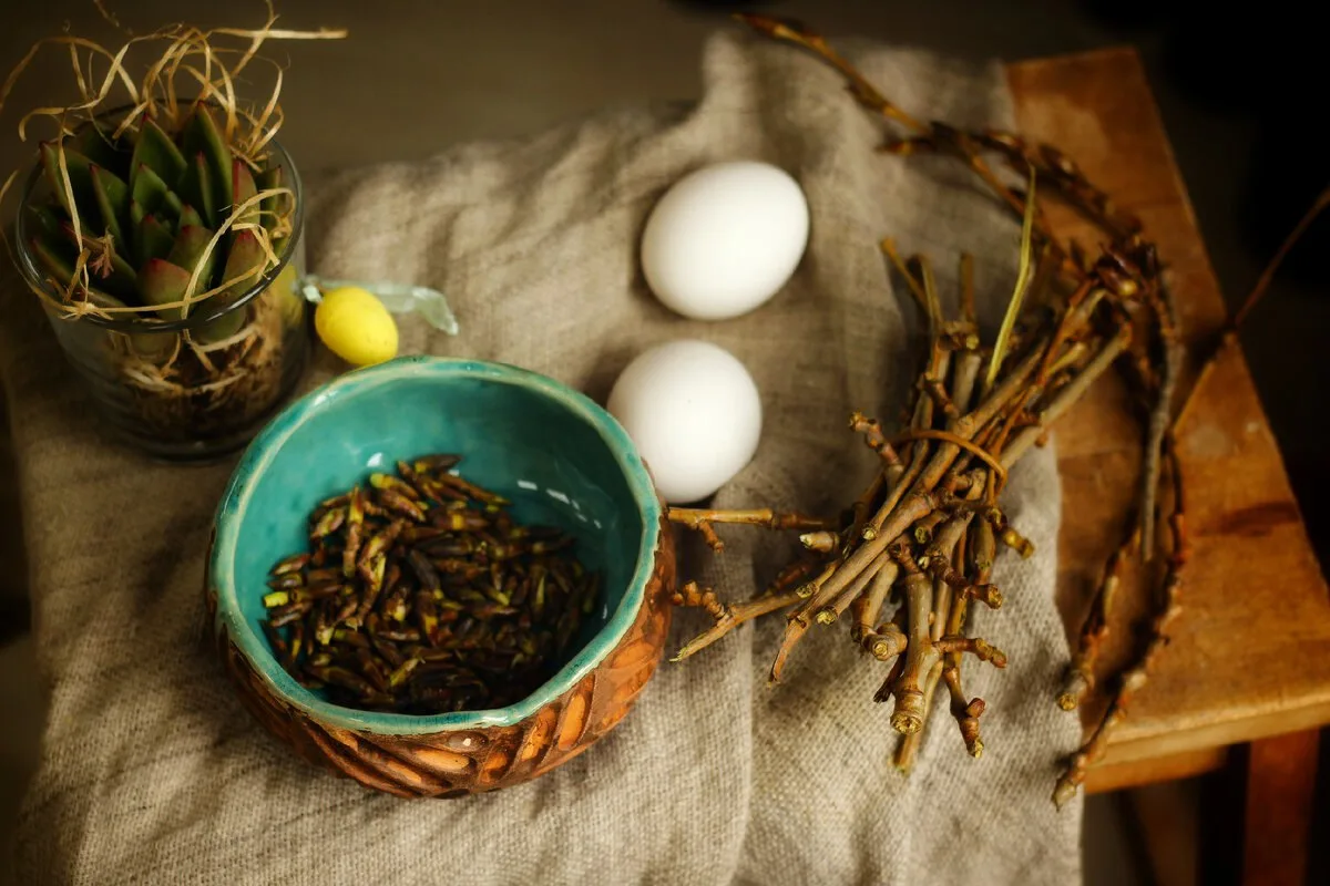 В истории, если покопаться, можно найти десятки всевозможных натуральных красителей, которые можно использовать и для окраски тканей, и пряжи, и яиц, конечно. Сегодня речь пойдет о прямом способе окрашивания без кислот при помощи веточек тополя, на который способны далеко не все вещества. Всеми известная луковая шелуха из их числа, она содержит танины (группа фенольных соединений растительного происхождения), которые обладают дубильным действием, сохраняя свежесть яиц дольше.