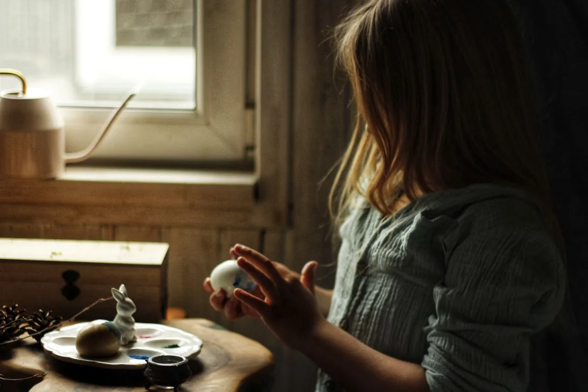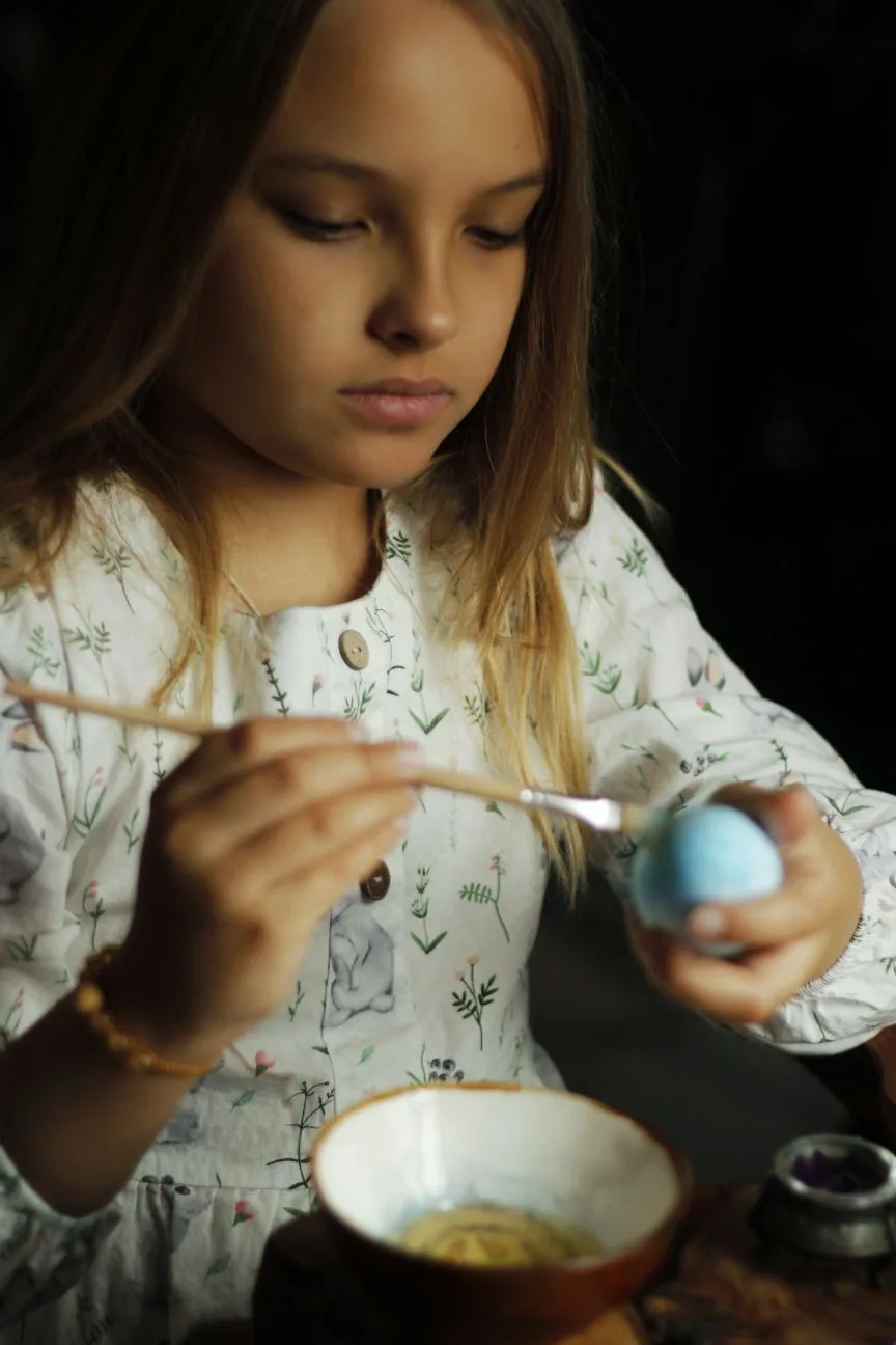 Я бегала, снимала корзинки, а насыпанные для фото в красивые ячейки краски - стояли на столе, как и яйца, отваренные для крашения. И что-то мы с Верой закружились, забегались и она набегу предложила попробовать просто покрасить яйца этими яркими красками, подобно акварели. Кисточки мы, конечно, не нашли - поэтому в ход пошли пальцы😄.