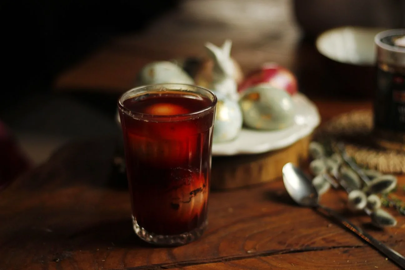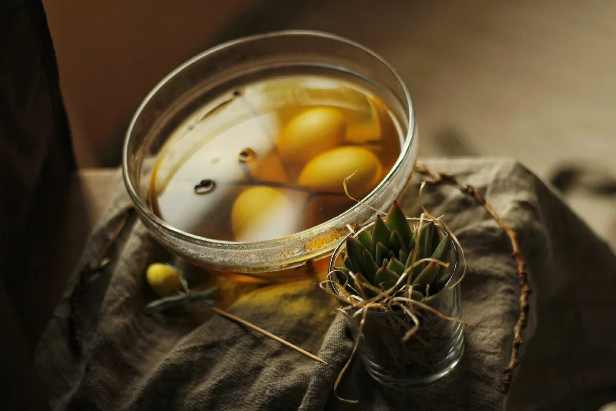 После того, как яйца сварились, Я перелила отвар в миску, убрав основную часть веток и оставив в нем яйца. Мне хотелось показать вам получившийся янтарный цвет получившейся воды.