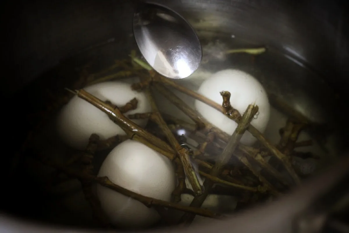 Вообще, во всех технологиях написано, что сначала надо сварить веточки в воде, процедить отвар, остудить, а затем сварить в нем яйца. Поскольку я не нашла ни одного подтверждения тому, что кто-то хоть раз действительно красил яйца тополем, я решила минимизировать временные затраты и просто отправила яйца комнатной температуры в такую же воду вместе с веточками, повторяя принцип окраски в луковой шелухе, раз уж красящие вещества в обоих случаях имеют одинаковый принцип действия.