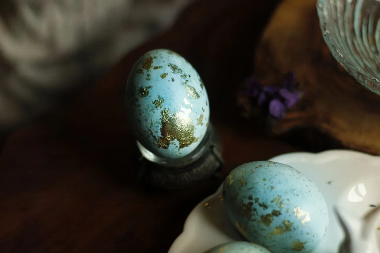 В процессе окрашивания все вокруг наполняется невероятным ароматом! Да, яйца тоже пахнут фиалкой, но насколько долго - не подскажу, потому что дочка настояла на покрытии получившихся яиц поталью золотой. Для этого мы взяли белок, кисточку и сухие хлопья потали, которую я использую для заливки смолой. Белком примазали поталь к яйцам - и готово. Красиво, быстро, просто.