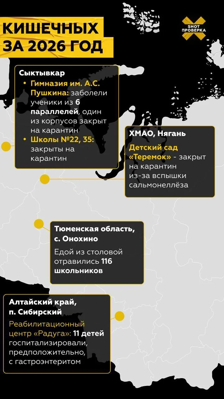 Вспышки кишечных инфекций среди школьников появились в Сыктывкаре: там на карантин ушло сразу несколько школ. Почти 100 учеников заболели норовирусом в Петербурге — предположительно, после купания в школьном бассейне. Едой из столовой отравились школьники в Тюменской области: там заболело 116 учеников. Региональные ведомства провели проверки.