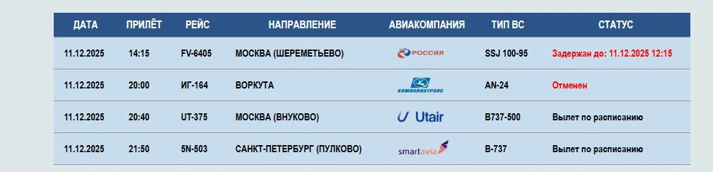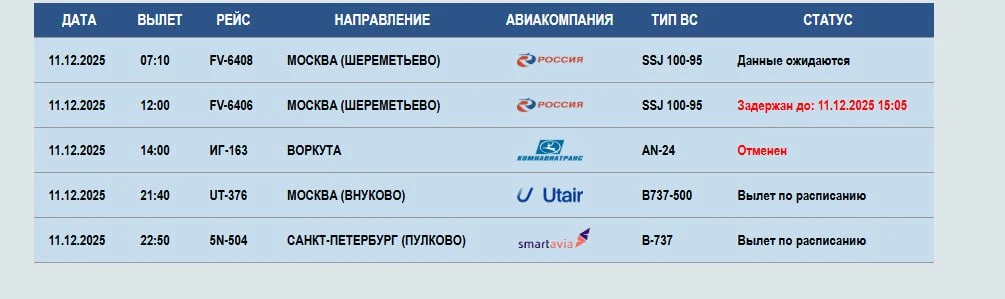 Задержан рейс из Сыктывкара в Москву с вылетом в 12:00 и рейс из Москвы в Сыктывкар с прилётом в 14:15. В аэропортах Москвы отменили и задержали почти 200 рейсов из-за масштабной атаки дронов.