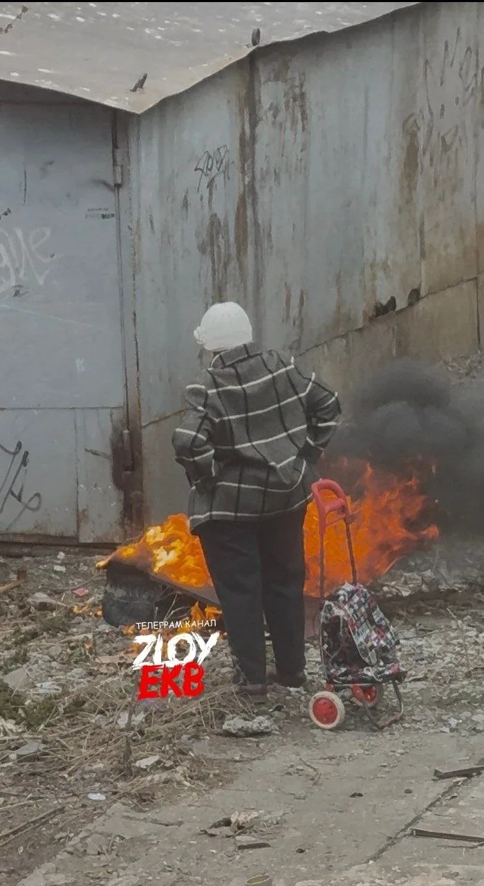 В юго-западном районе бабуля решила толь от мусора избавиться, а может от улик - подожгла покрышку за контейнерной площадкой.