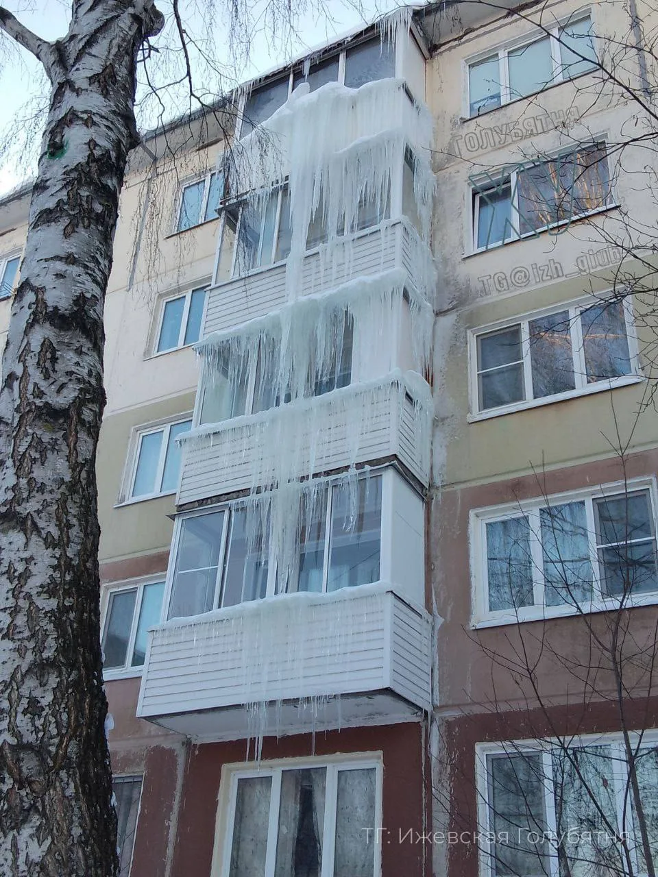 В Ижевске на фасаде пятиэтажки «выросла» гигантская ледяная гирлянда, сковавшая четыре балкона