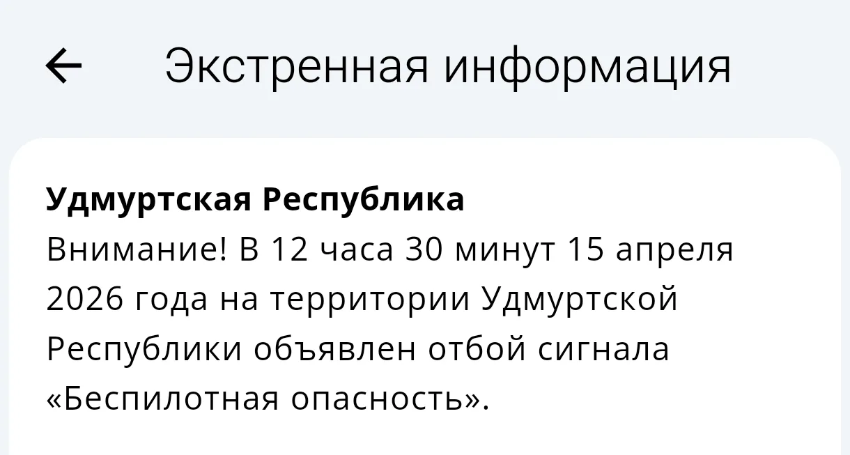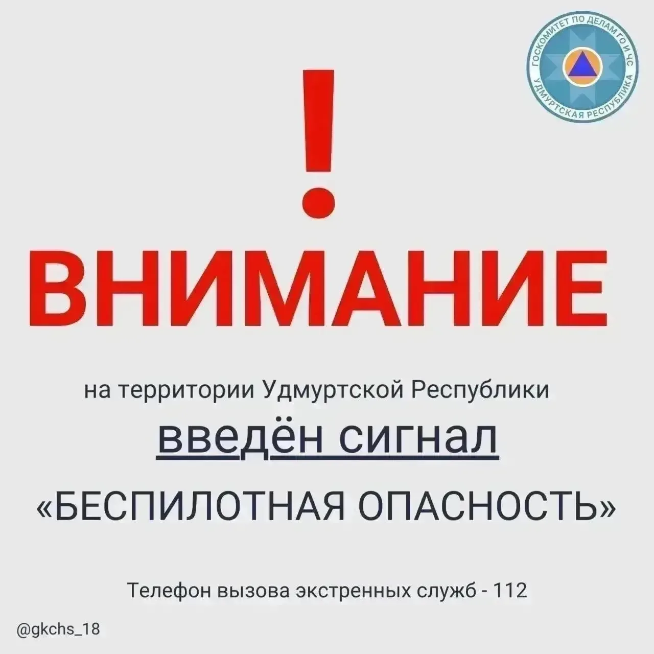 Внимание! В 8:30 15 апреля на территории Удмуртской Республики введен сигнал «Беспилотная опасность».