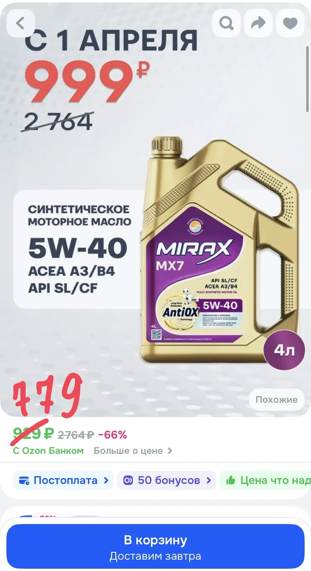 ИТАК! 4 литра универсального синтетического моторного масла за 7️⃣7️⃣9️⃣₽! Это всего 195₽ за литр! Это выгодно!