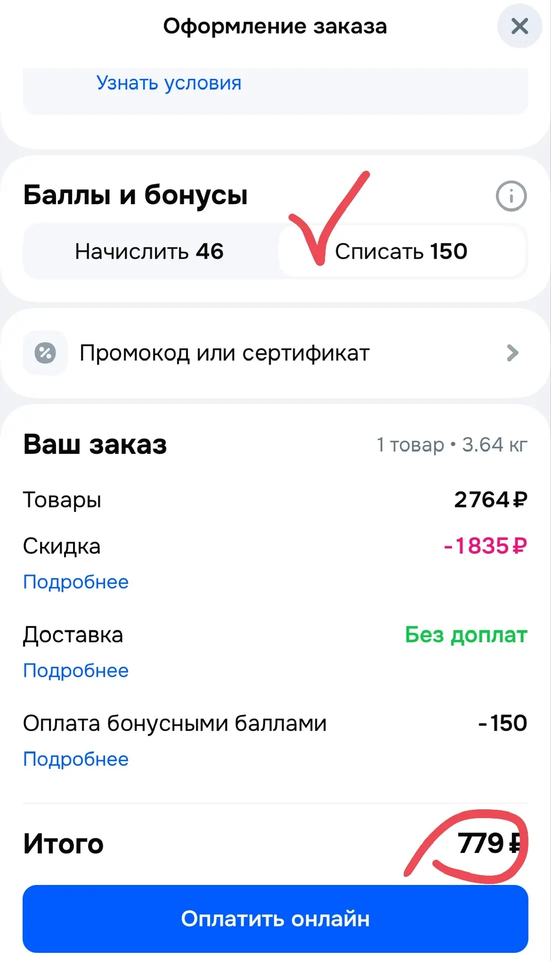 ✔️Сначала чуть ниже берем бонусы продавца и потом списываем их при оплате.
