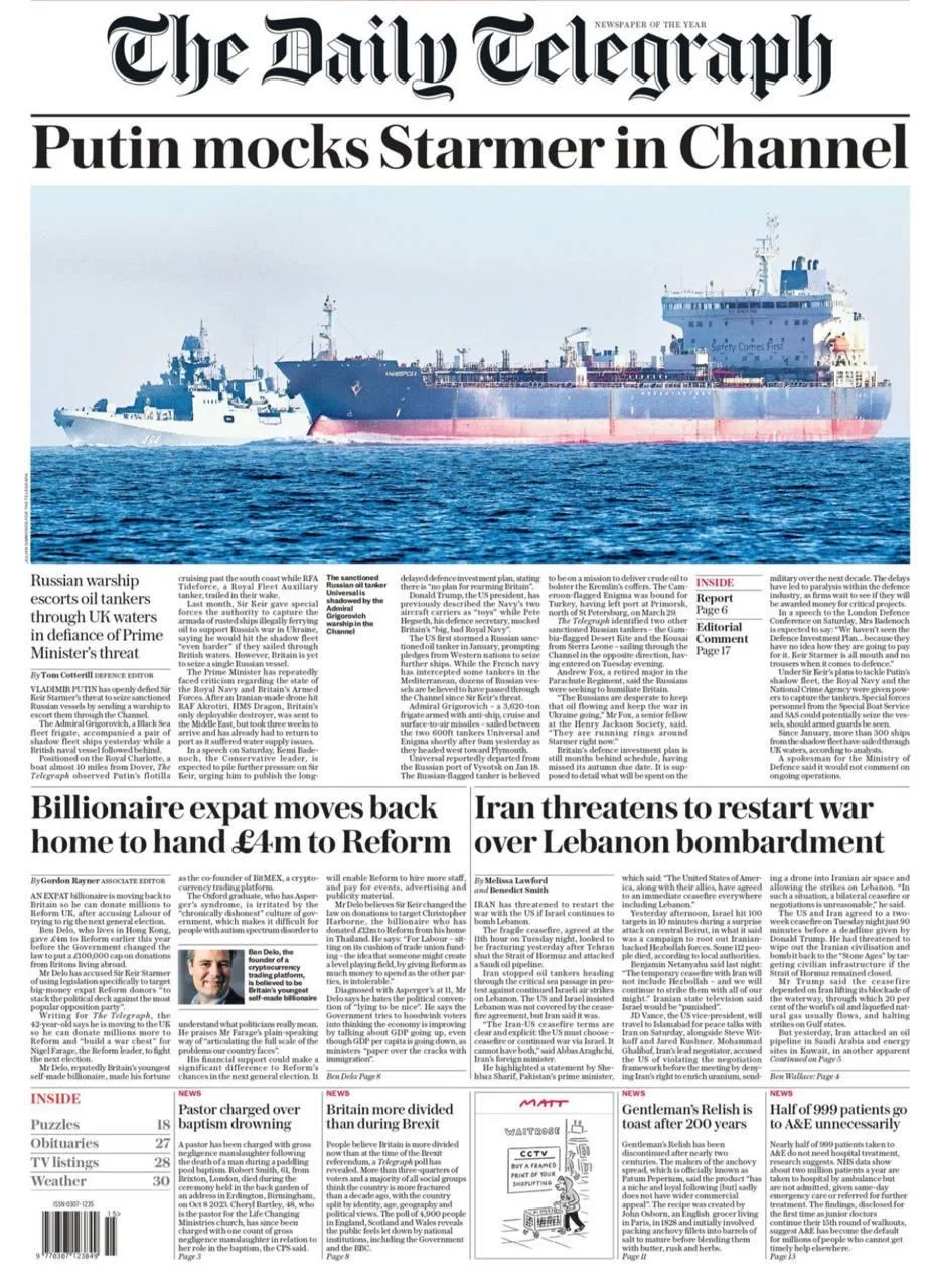 Боевой листок британского обкома The Telegraph пишет, что российский фрегат «Адмирал Григорович» сопроводил два подсанкционных танкера вдоль южного побережья Англии, проигнорировав угрозы британского премьера захватить суда. Ну а чего они хотели?