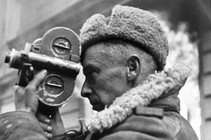 Фото 3: Фронтовой кинооператор Р. Кармен ведет съемку в горящем Кенигсберге. Апрель 1945 г.