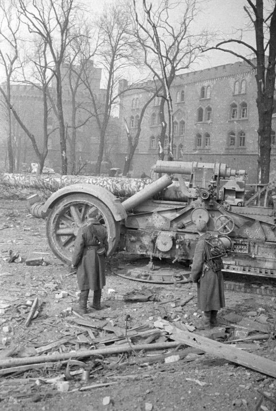 Фото 1: Бойцы РККА возле захваченной немецкой 210-мм мортиры в Кенигсберге. Апрель 1945 г.