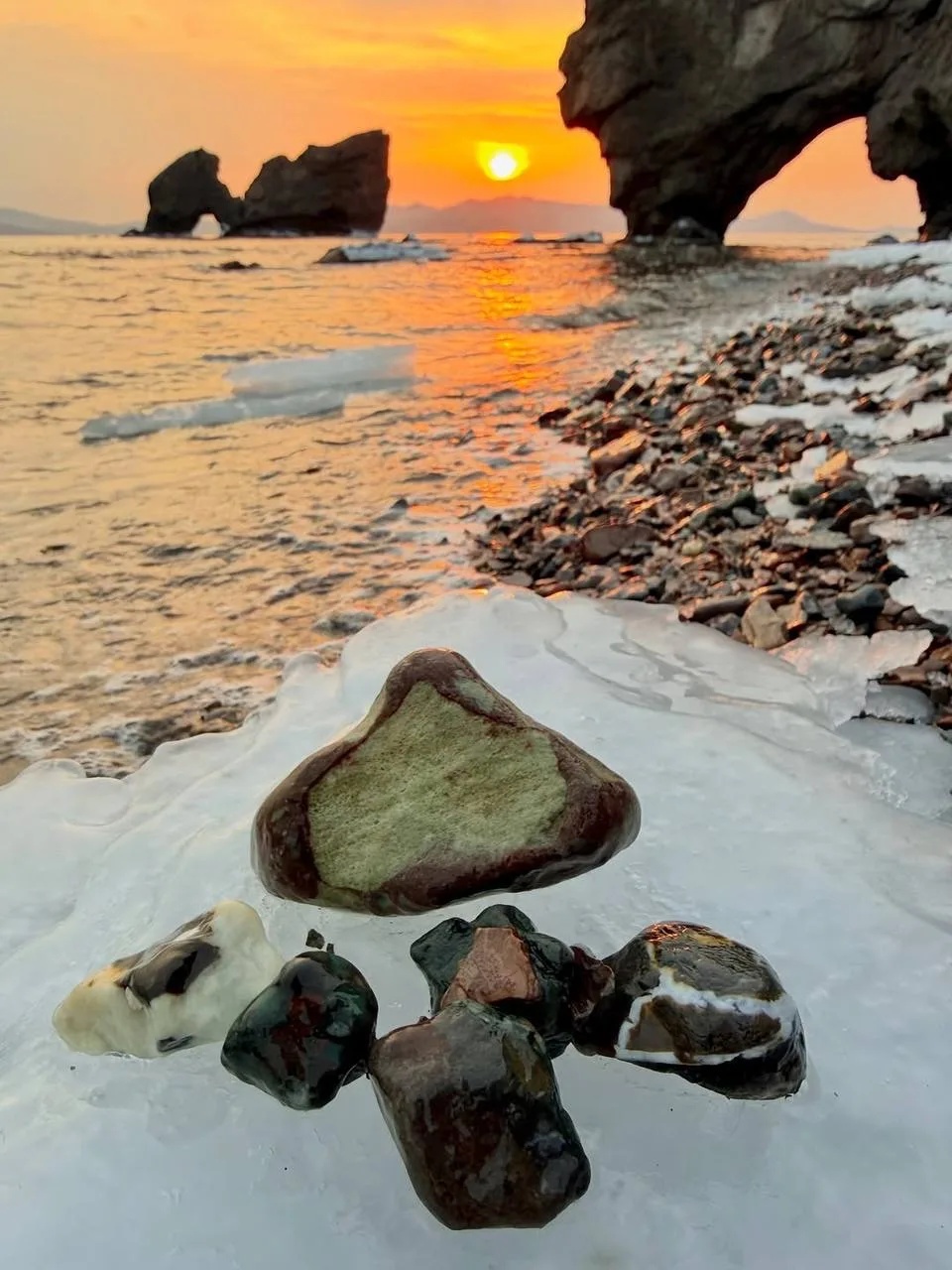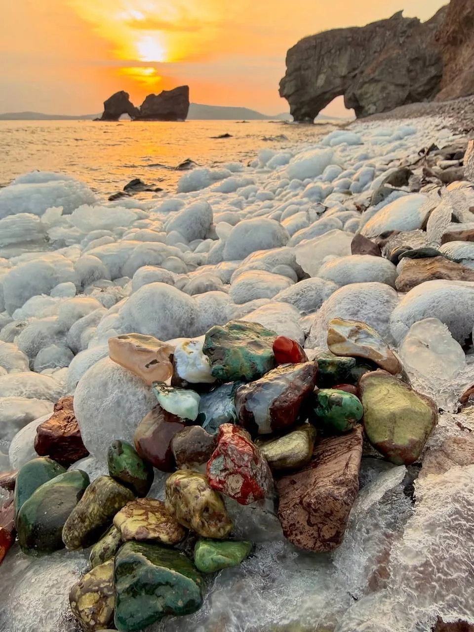 Сама бухта названа так неспроста. Тут находится много камней и минералов. Именно они придают особый шарм пейзажу в зимний период из-за наледи.