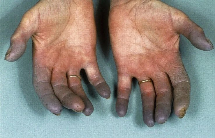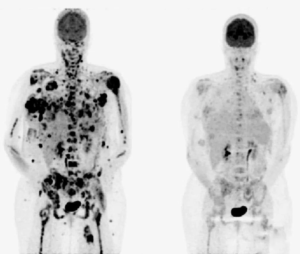 Снимок человека с метастазами кожи (более тёмные на фото) до и после проведённой химиотерапии