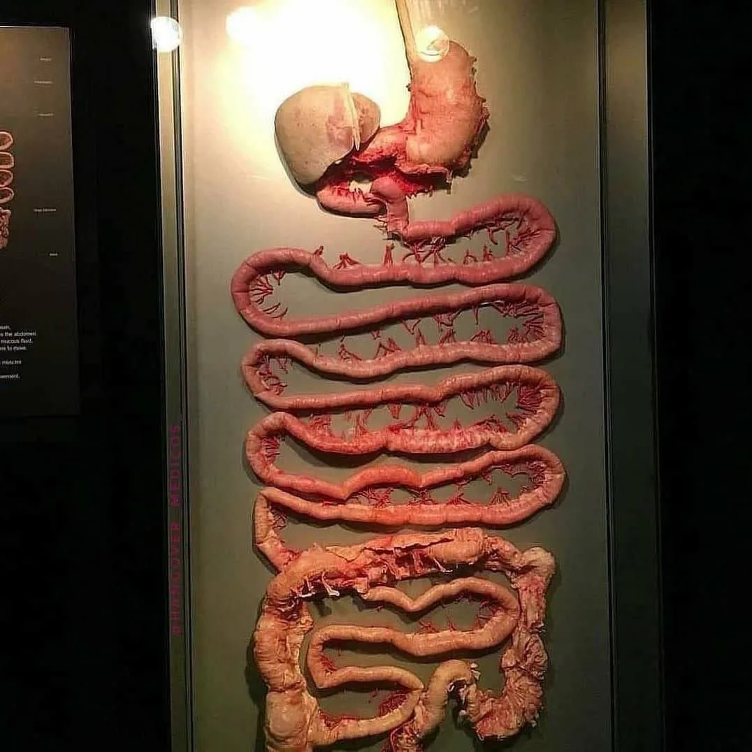 На фото представлен желудочно-кишечный тракт человека, начиная с пищевода, за которым следуют желудок, тонкий кишечник и, наконец толстый кишечник, заканчивающийся прямой кишкой