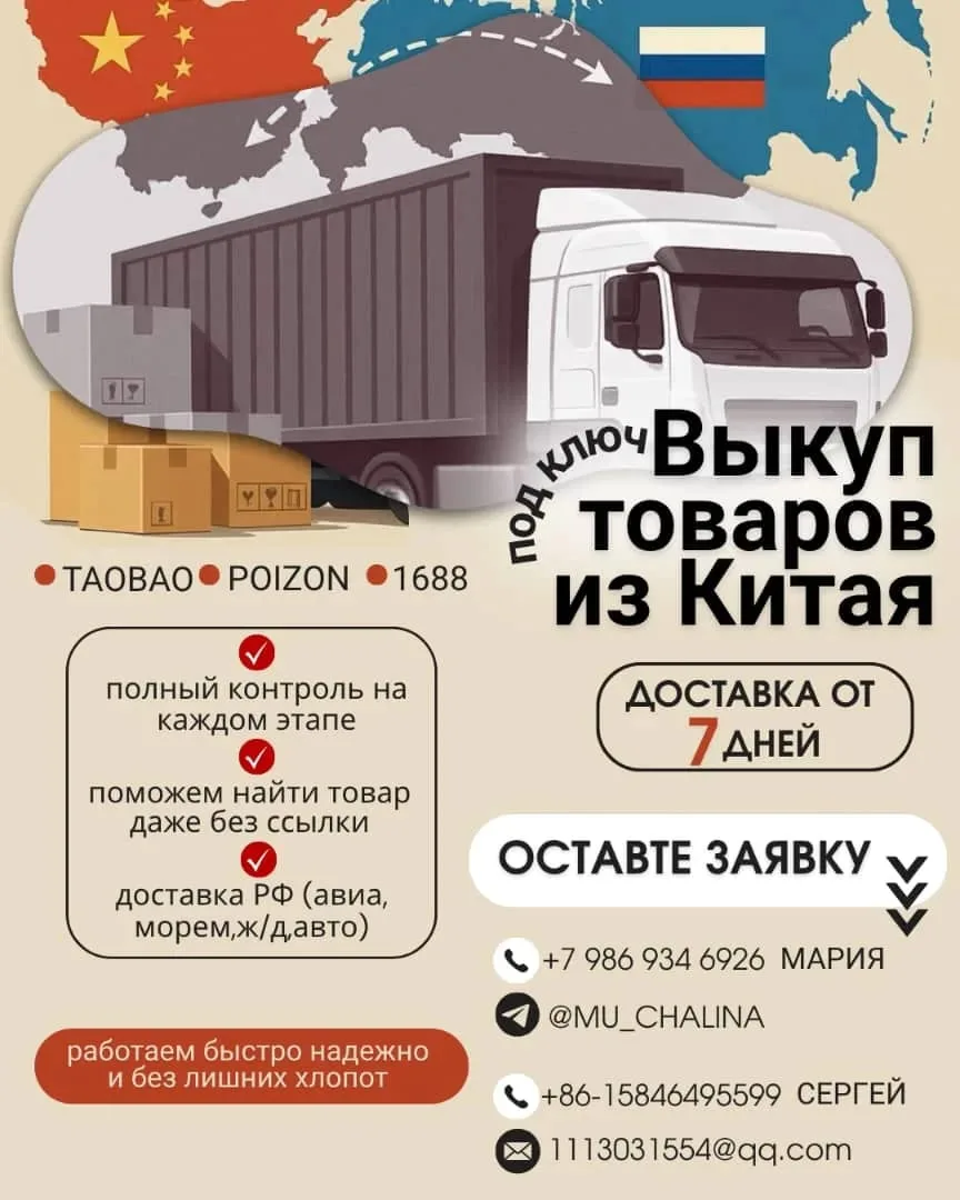 Всем привет!отправляем любые товары из Китая в Россию.также поищу фабрик и заводов в Китае,выкупаем товары с сайтов 1688.ТаоВао.POIZON.телефон(WhatsApp):+86-15846495599.
