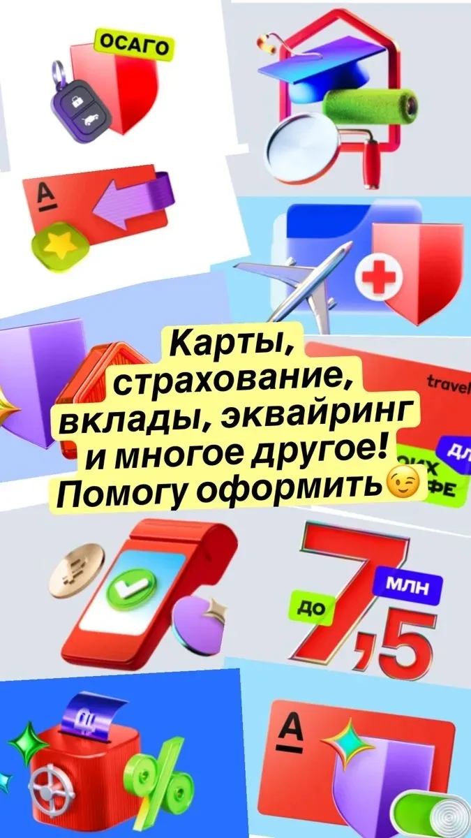 Буду рада помочь Вам в оформлении различных банковских продуктов, таких как: ОСАГО, КАСКО, дебетовых, кредитных, детских карт, оформление ипотеки, открытие своего бизнеса и многое другое 😊