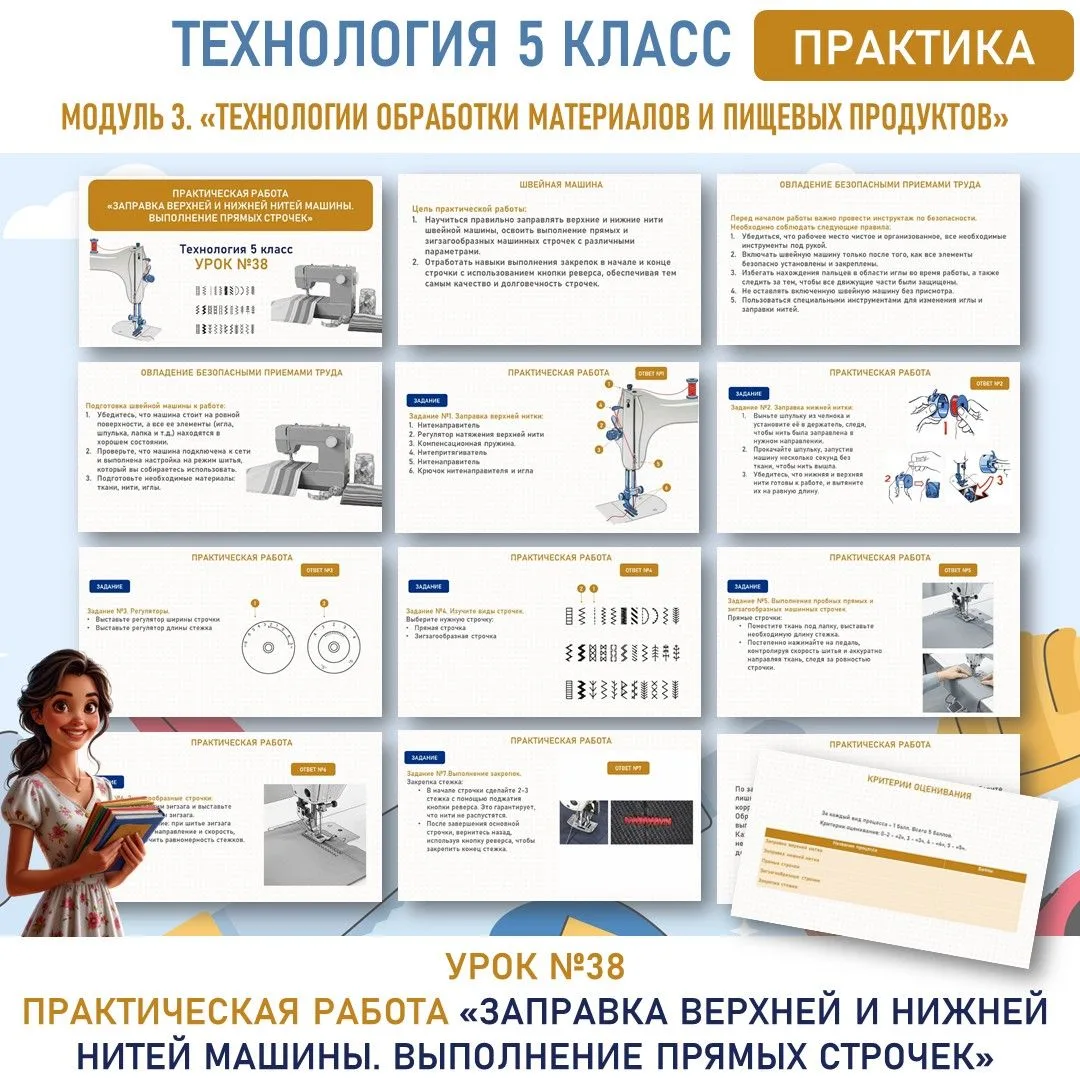 🆕Практическая работа «Заправка верхней и нижней нитей машины. Выполнение прямых строчек». Труд (технология) 5 класс. Урок №38.