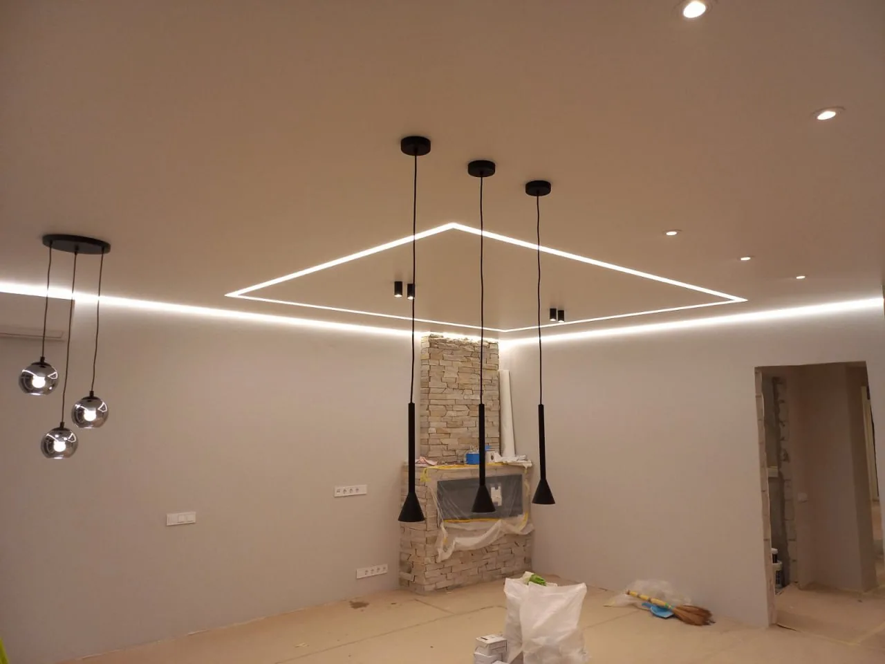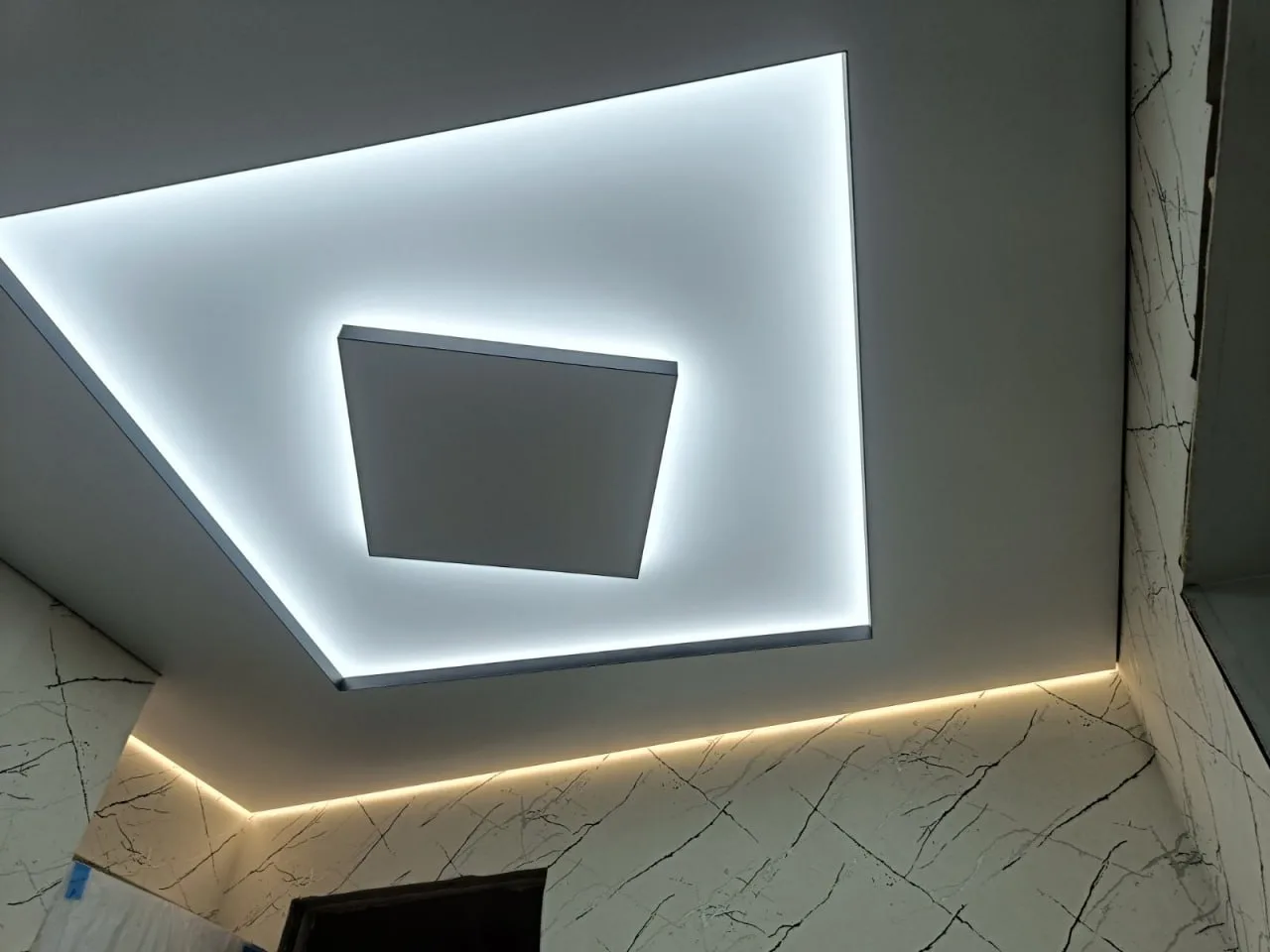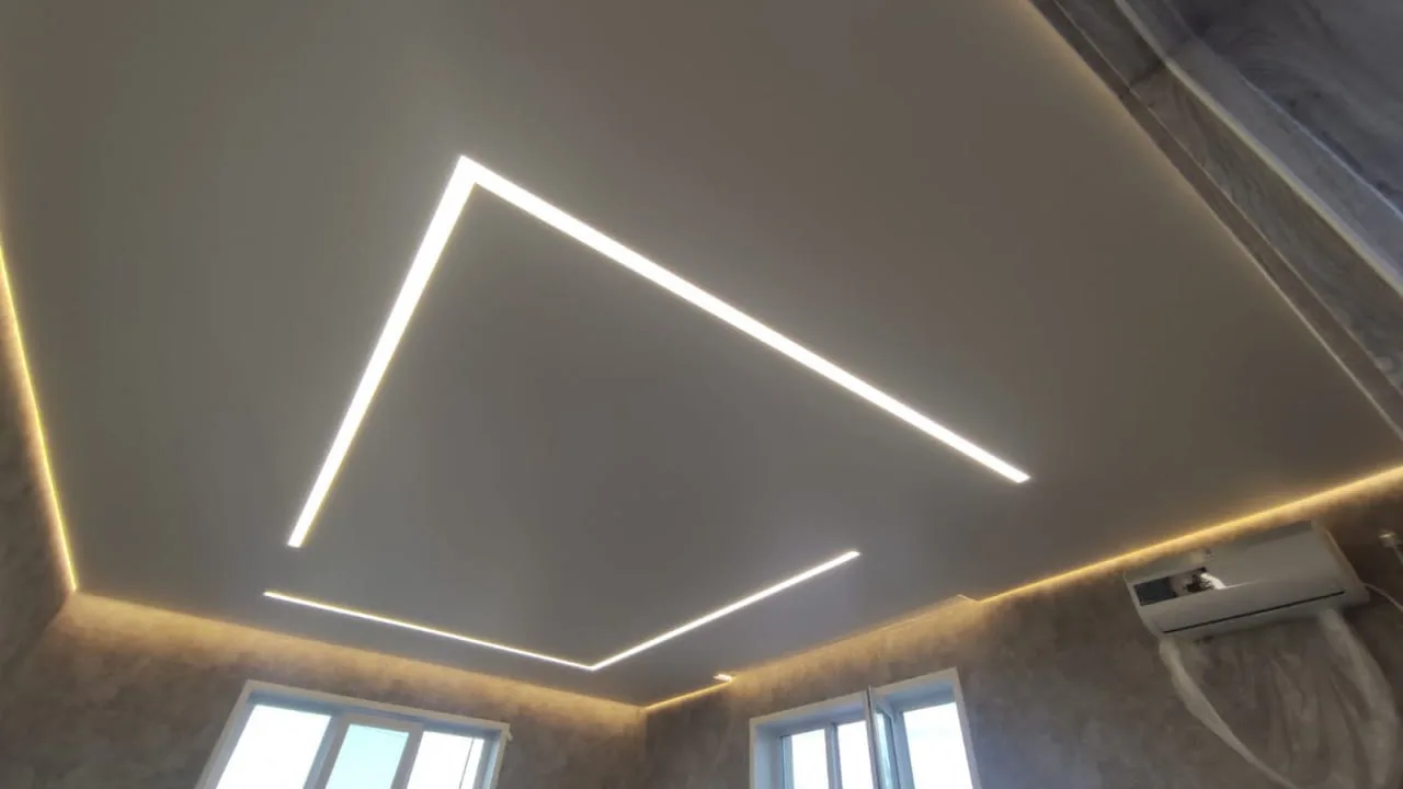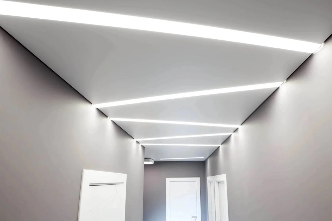 Как выглядит: Здесь между полотном потолка и стеной также есть зазор (обычно шире, чем у теневого – от 15 мм). Но главное отличие – в этот зазор встраивается светодиодная лента (LED), направленная вниз или вверх.