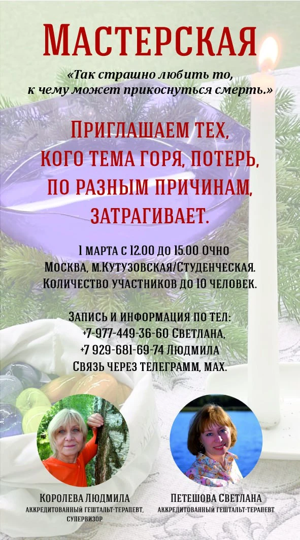 Мы приглашаем тех, кому важно прожить свои утраты, потери в безопасном пространстве с поддержкой участников и ведущих на мастерскую "Так страшно любить то, к чему может прикоснуться смерть".