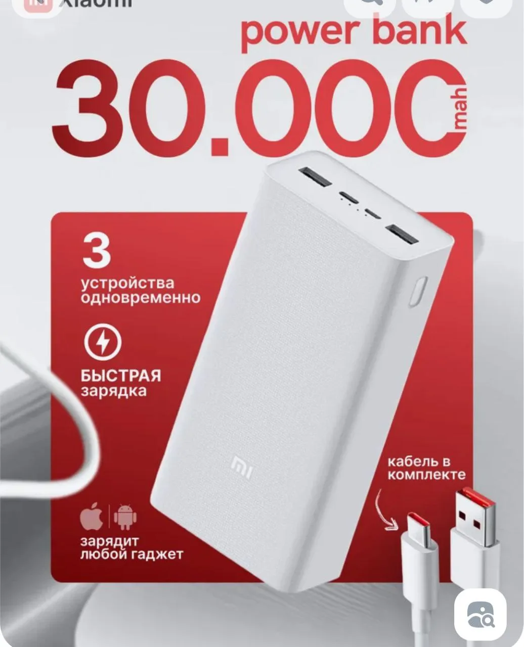 Цена-1190-Повербанк (powerbank) 30000 mah с быстрой зарядкой/внешний аккумулятор портативный, переносной, мощный, универсальный для телефона/смартфона, белый