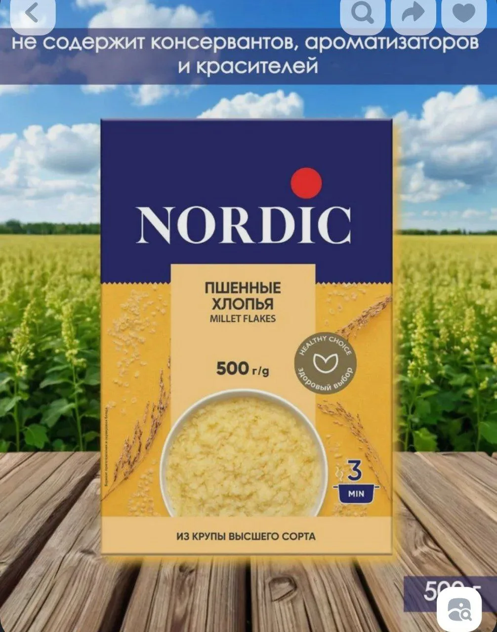 Е. Цена 149 рХлопья Nordic пшенные 500 г. Дефект коробки