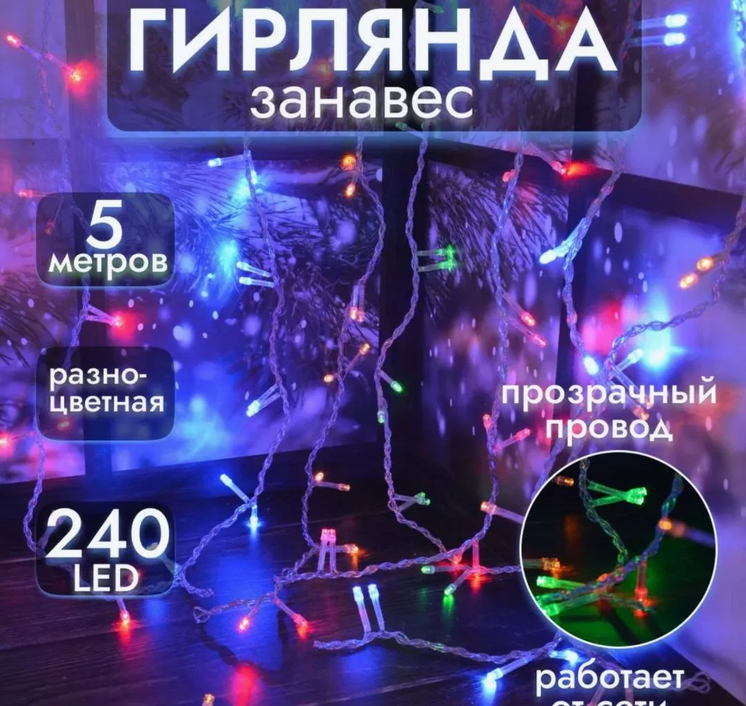 Цена-490-Гирлянда на елку новогодняя электрическая "Занавес" 240 ламп многоцветная, 2,2*1,5м, 8 режимов