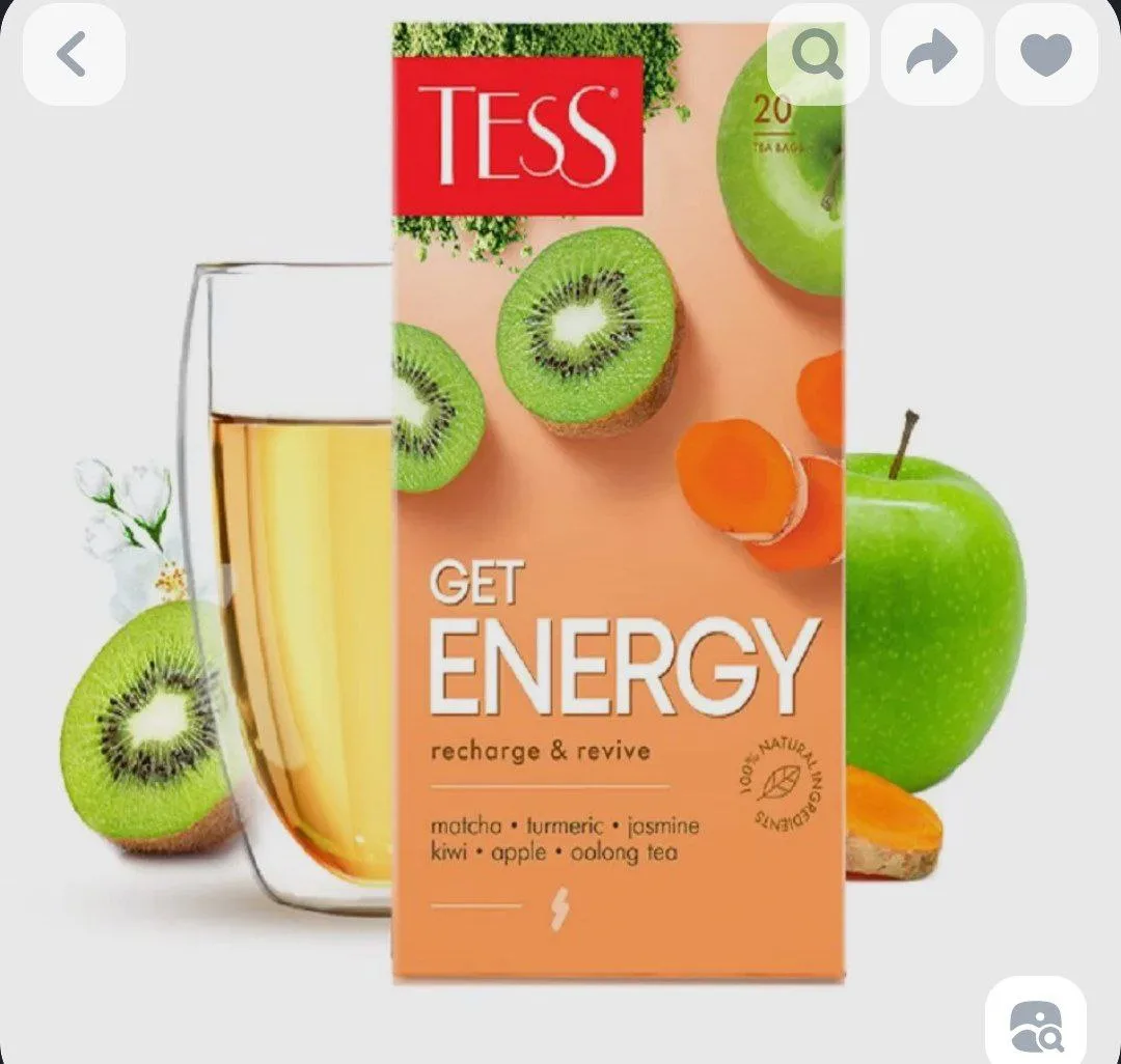 Е. Цена 89 рЧай в пакетиках травяной TESS Get ENERGY (Гет Энерджи) с ароматом киви и жасмина, 20 пак.. Дефект коробки. До2026 г
