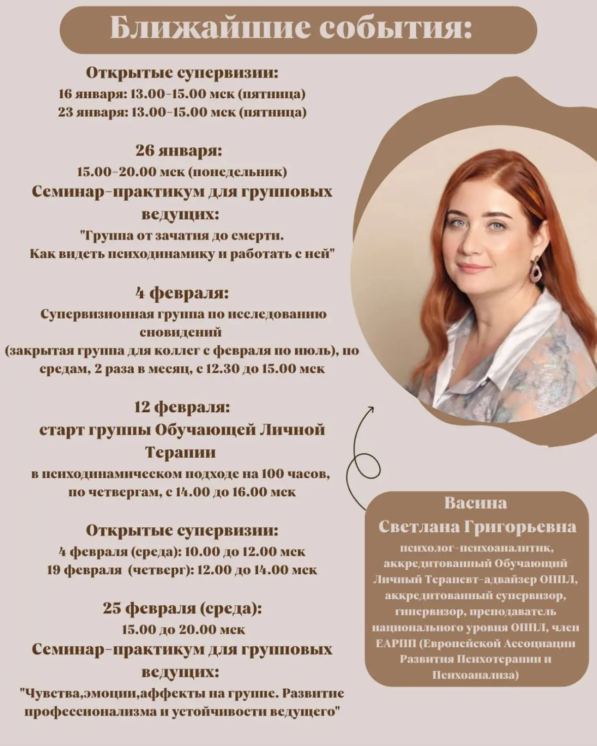 Уважаемые коллеги, здравствуйте! Я Васина Светлана Григорьевна, психолог-психоаналитик, аккредитованный Обучающий Личный Терапевт-адвайзер, аккредитованный супервизор и гипервизор ОППЛ, преподаватель национального уровня ОППЛ. Приглашаю вас на события января и февраля 2026 года. https://t.me/SVasinapsy