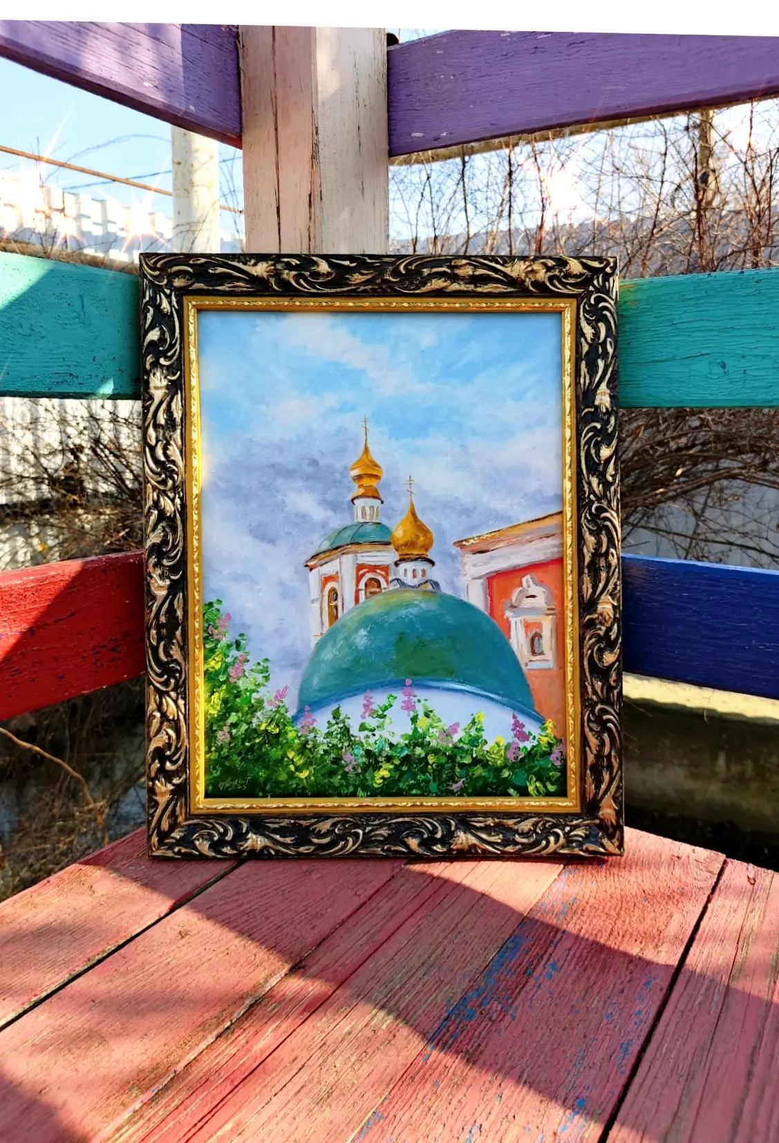 Картина маслом. "Храм в окружении цветения". Холст 30/40.