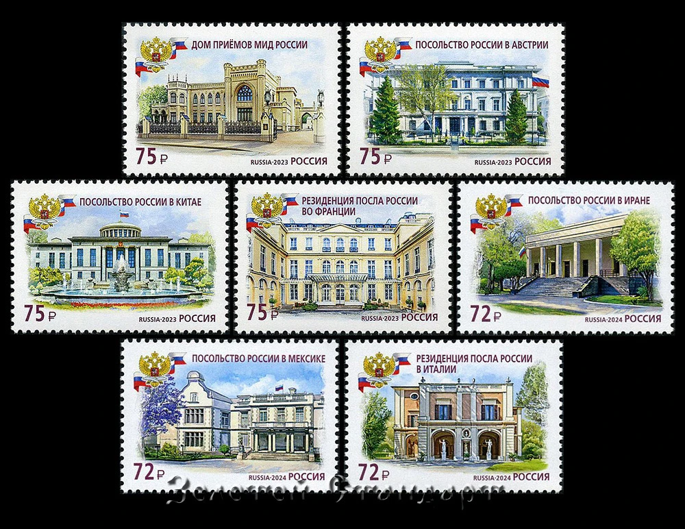 Тематическая подборка "Здания дипломатических представительств МИД России" 2023-2024 гг. - 7 марок (полная серия на 23.10.2024 г.).
