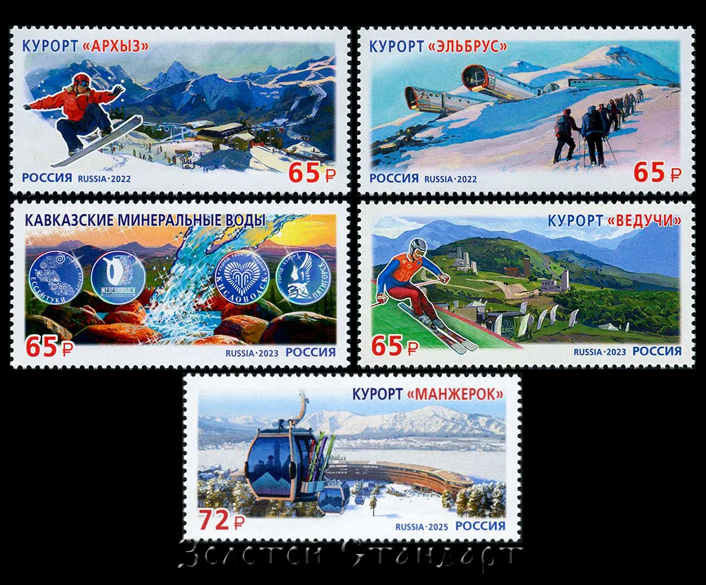 Тематическая подборка "Курорты России" 2022-2025 гг. - 5 марок (полная серия на 27.02.2025 г.).