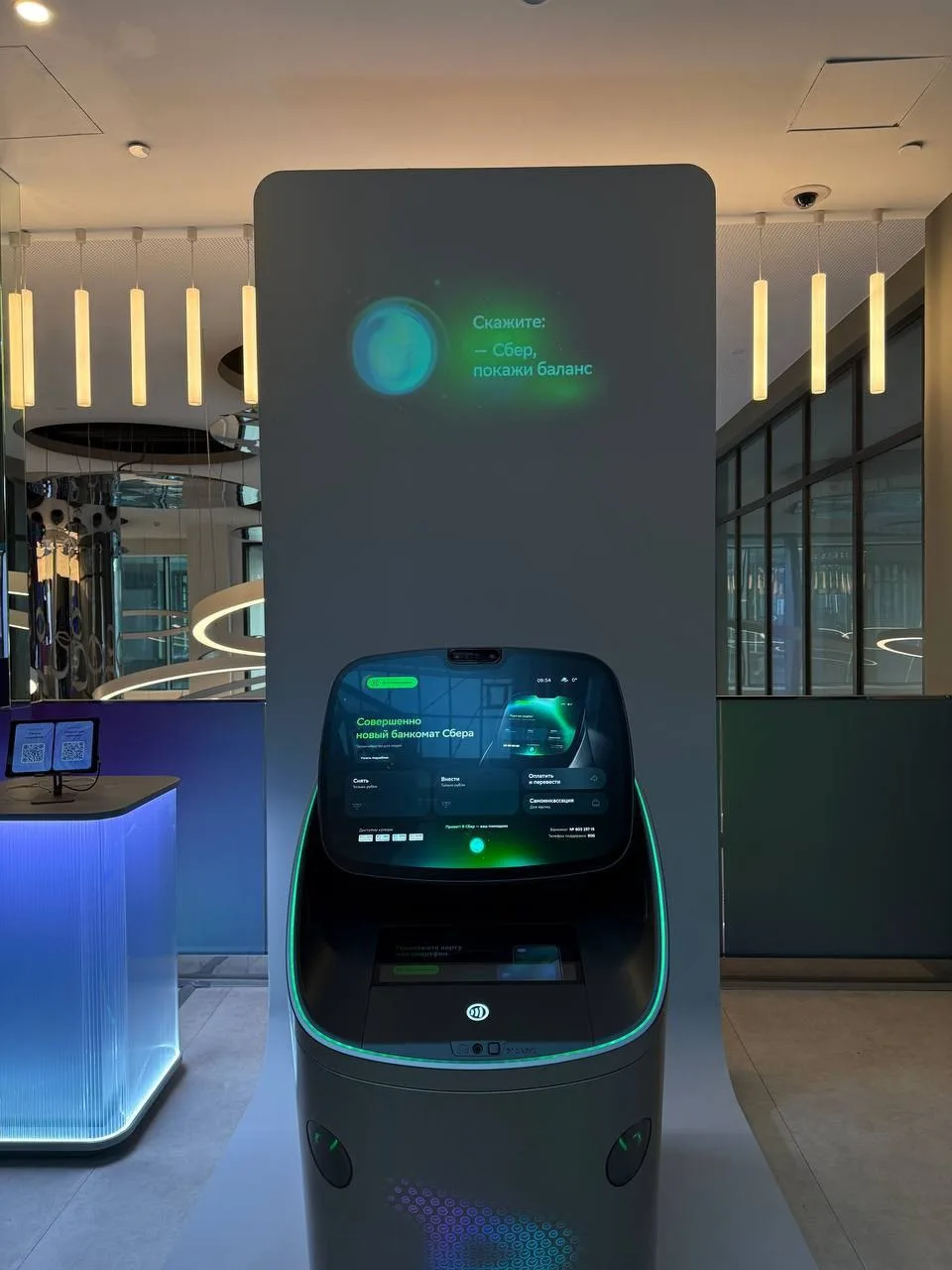 Отечественный ассистент GigaChat позволяет управлять устройством голосовыми командами и может проконсультировать по банковским услугам. Перед банкоматом создана световая зона: зелёная подсветка приглашает клиента для обслуживания, оранжевая — показывает, что остальным нужно находиться за пределами этой зоны.
