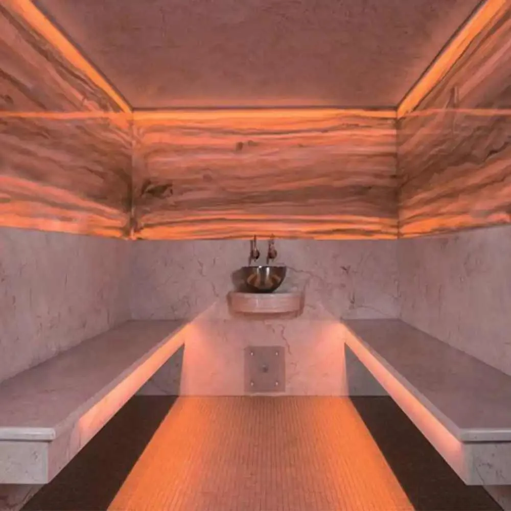Главный секрет мрамора в том, что он быстро прогревается и долго держит тепло. Лечь на мраморную лавку в хаммаме — значит почувствовать мягкое, равномерное тепло, которое расслабляет мышцы и не обжигает кожу.