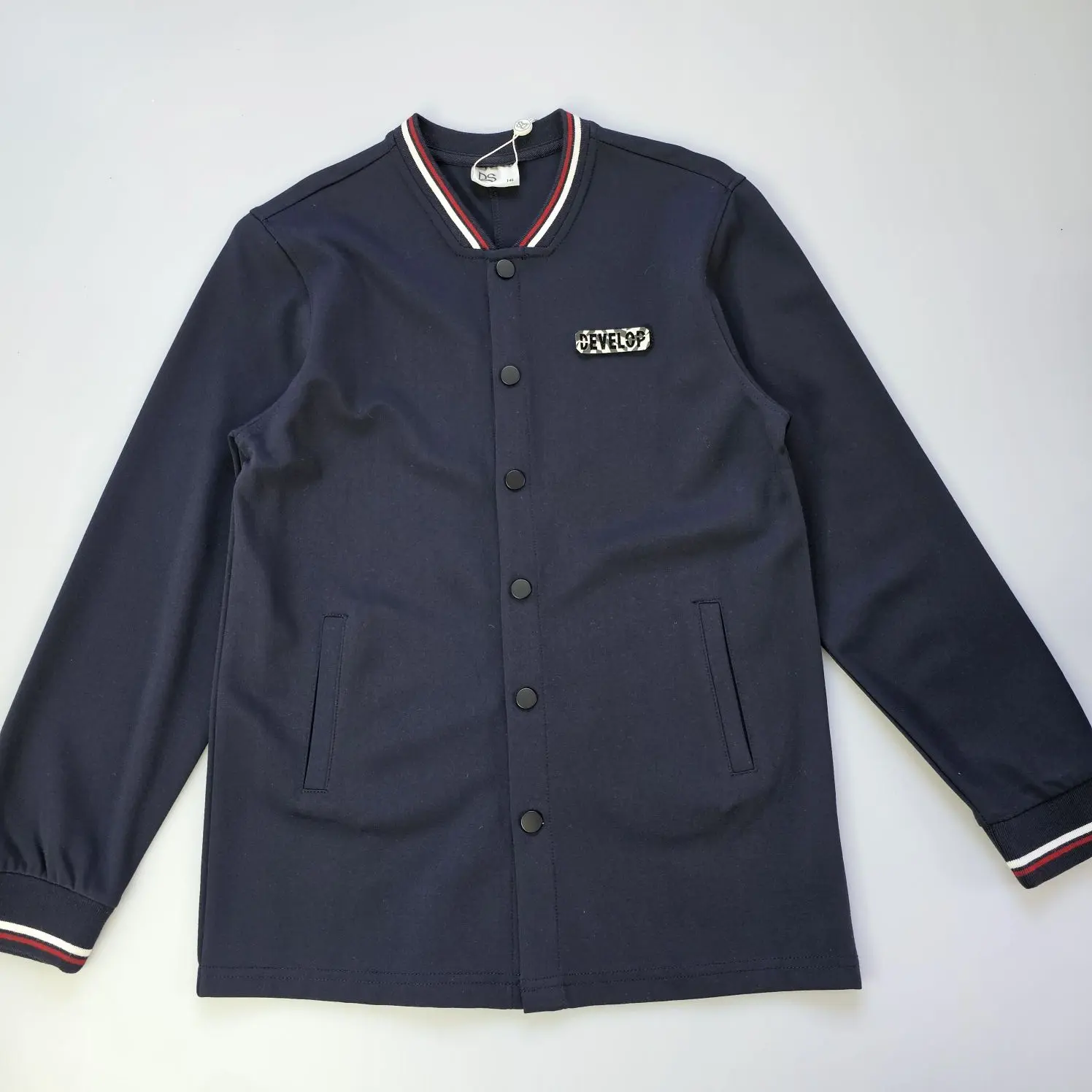 Удобный бомбер из плотной трикотажной ткани, с двумя рабочими карманами, на кнопках, рукав с трикотажной манжетой. Прекрасный вариант для школы.