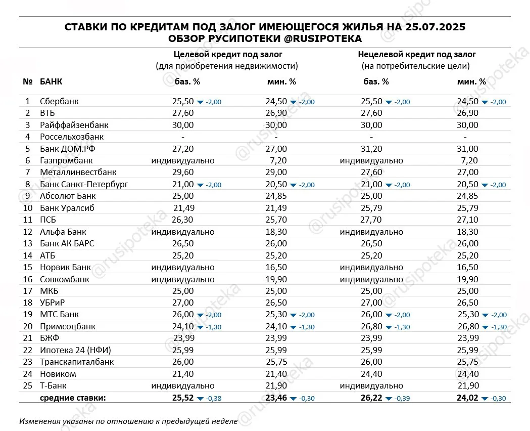 ❗️Ставки по программам кредитования под залог имеющегося жилья по итогам прошлой недели с 18 по 25 июля 2025 года. При анализе использовались следующие параметры: коэффициент К/З – 70%, сумма – 3 млн рублей.