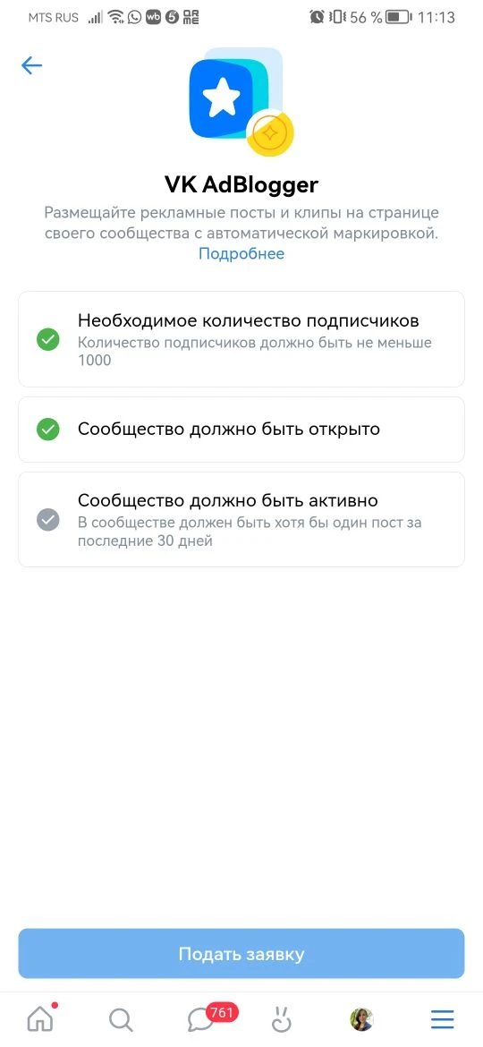 Должно быть минимум 10000 подписчиков в другой соц сети и обязательно канал или личная страница должна быть зарегистрирована в Роскомнадзоре