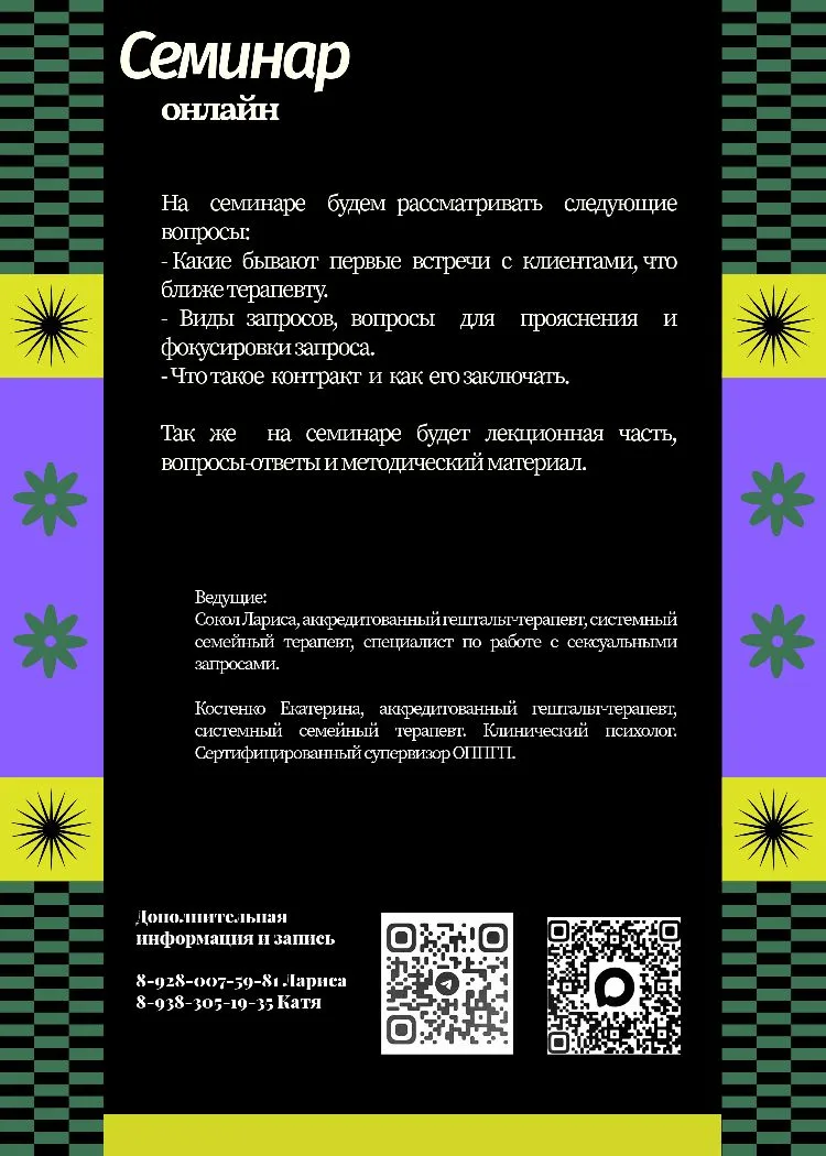 - Получить опыт проживания групповой динамики и поддержки, что ценно для дальнейшей практики.