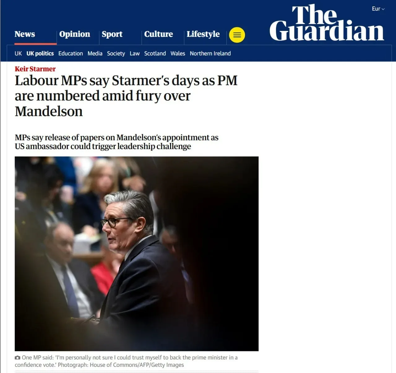 ▪️Депутаты-лейбористы в частных разговорах уже заявляют, что «дни Стармера сочтены». Ситуация, по оценке The Guardian, может перерасти в масштабный политический кризис и закончиться его отставкой.