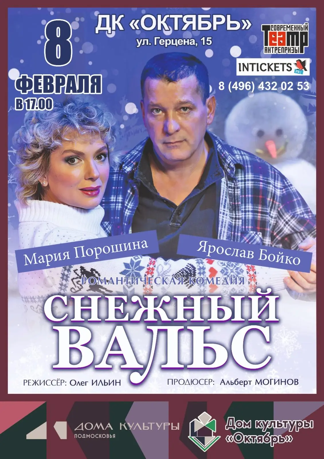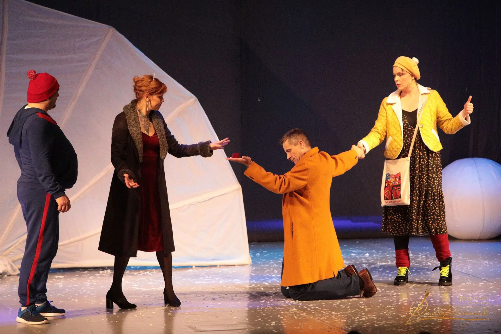 Мария Порошина и Ярослав Бойко на сцене РДК в романтической комедии по пьесе Питера Куилтера "Пленённые в снегу".