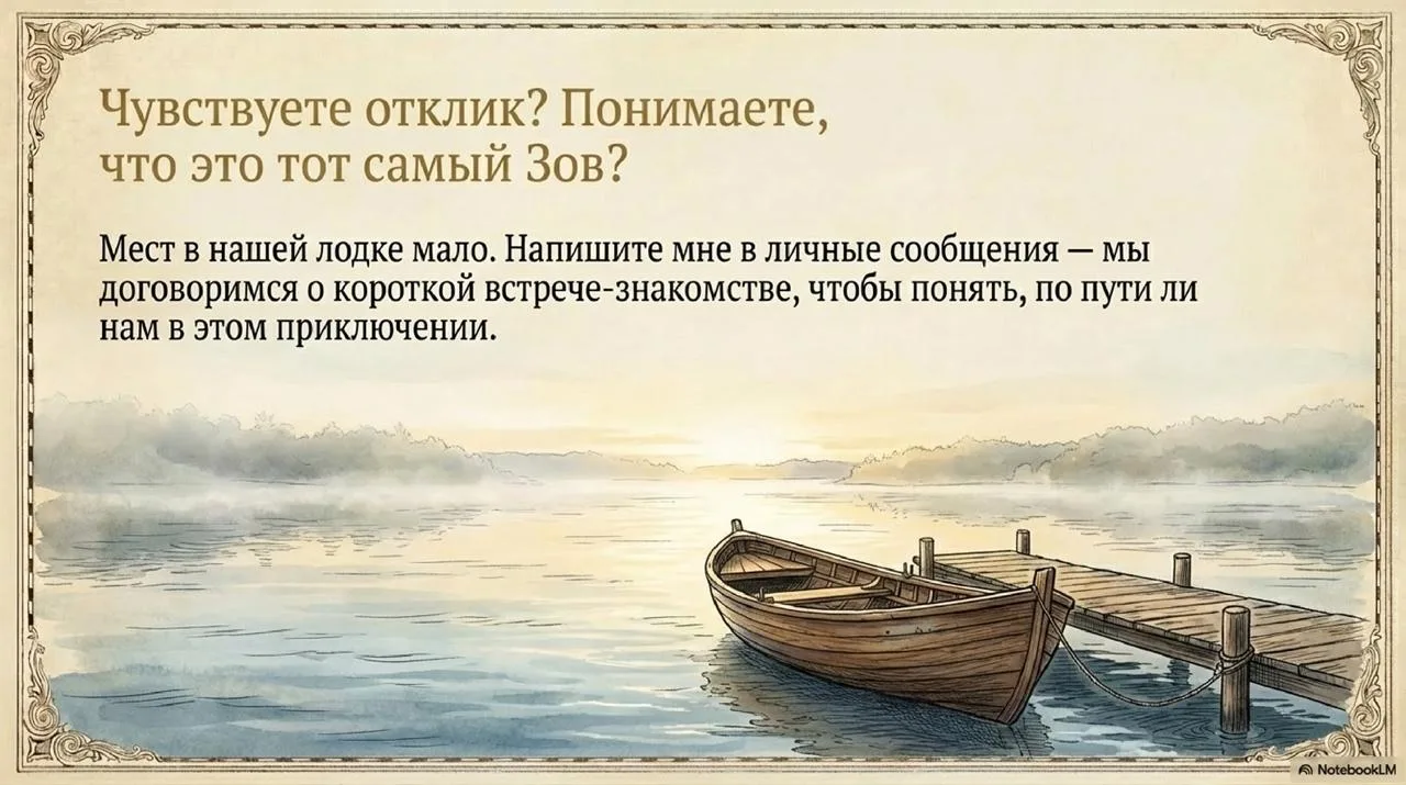 Мест в лодке мало. Чтобы понять, по пути ли нам в этом приключении, напишите мне в личные сообщения — мы договоримся о короткой встрече-знакомстве.