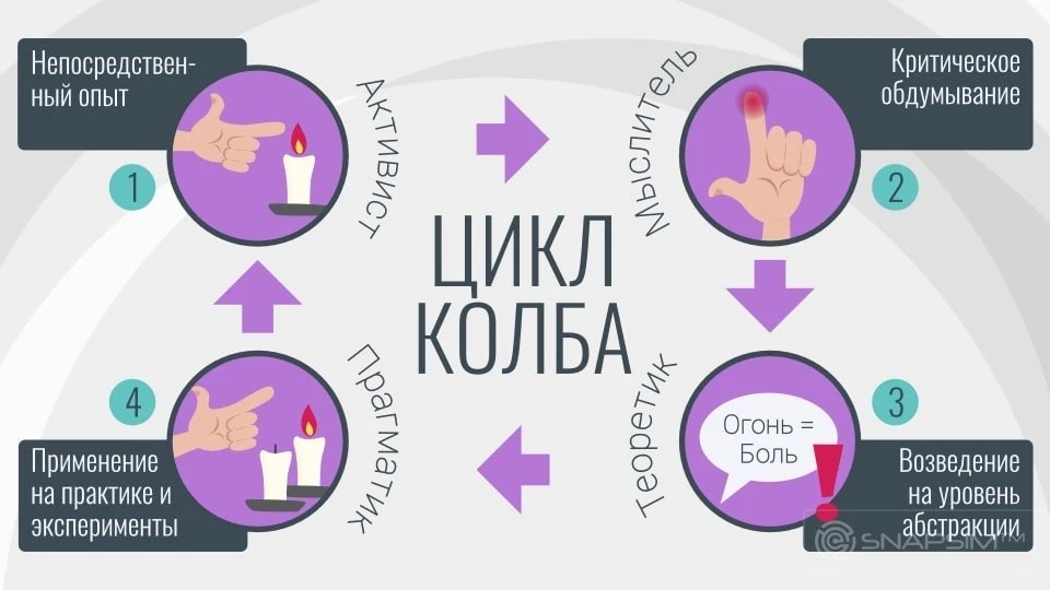 Объясняю на примере Цикла Колба, что на картинке. Есть такой американский педагог Дэвид Колб, который открыл вот такую модель обучения человека. Состоит этот цикл обучения из 4 частей - конкретный опыт, задача; наблюдение, анализ опыта; теория, выводы; эксперименты. И вот, что происходит: