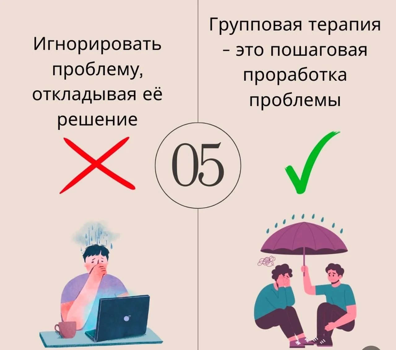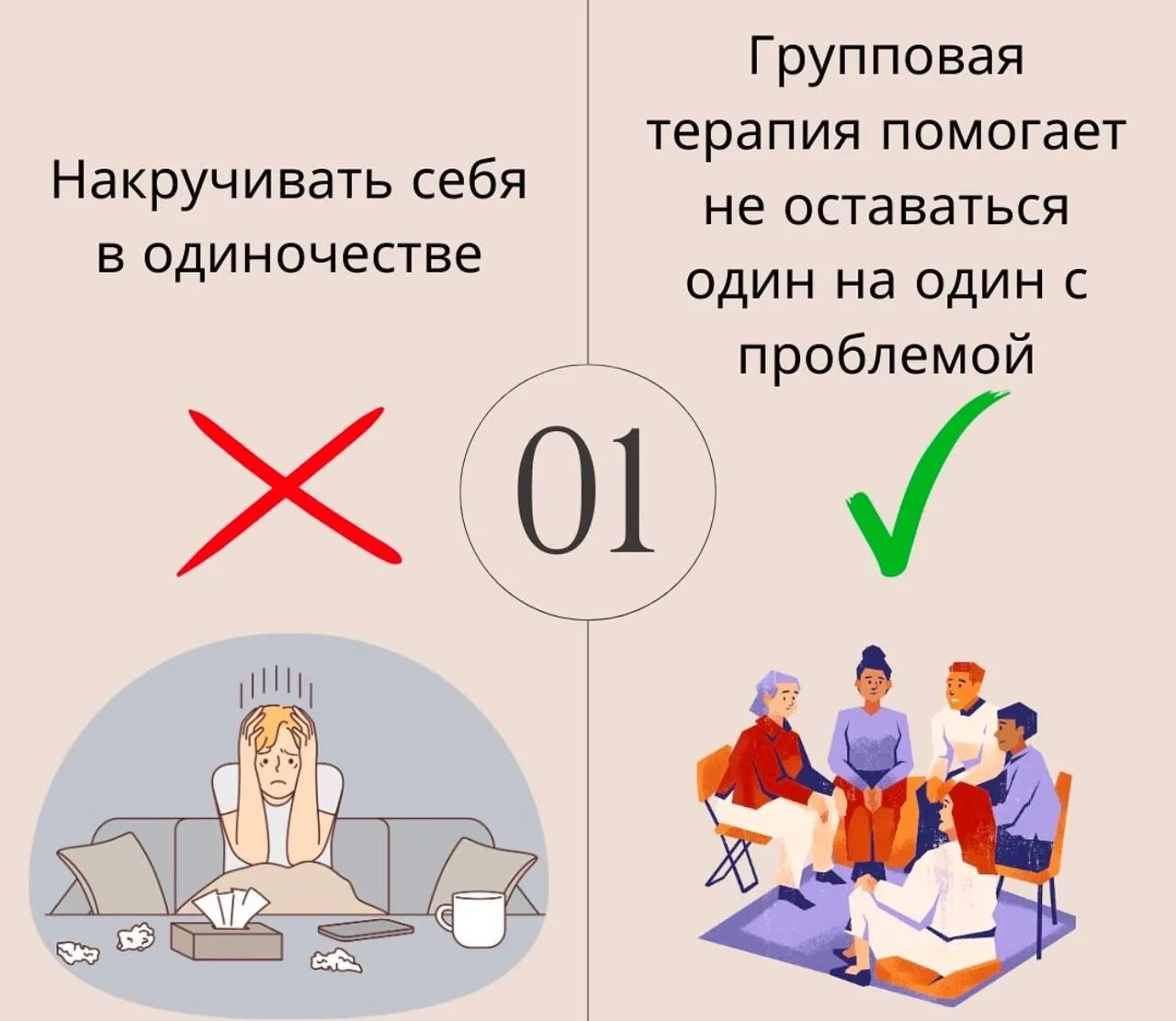 ✔ Это происходит через расширение картины мира и возможностей слыша других участников, понимая, что вы не одиноки и большинство имеет схожие трудности, вы увидите, как другие действуют в подобных ситуациях, вы разделите свои переживания и вы будите в том приняты со всеми своими тараканами.